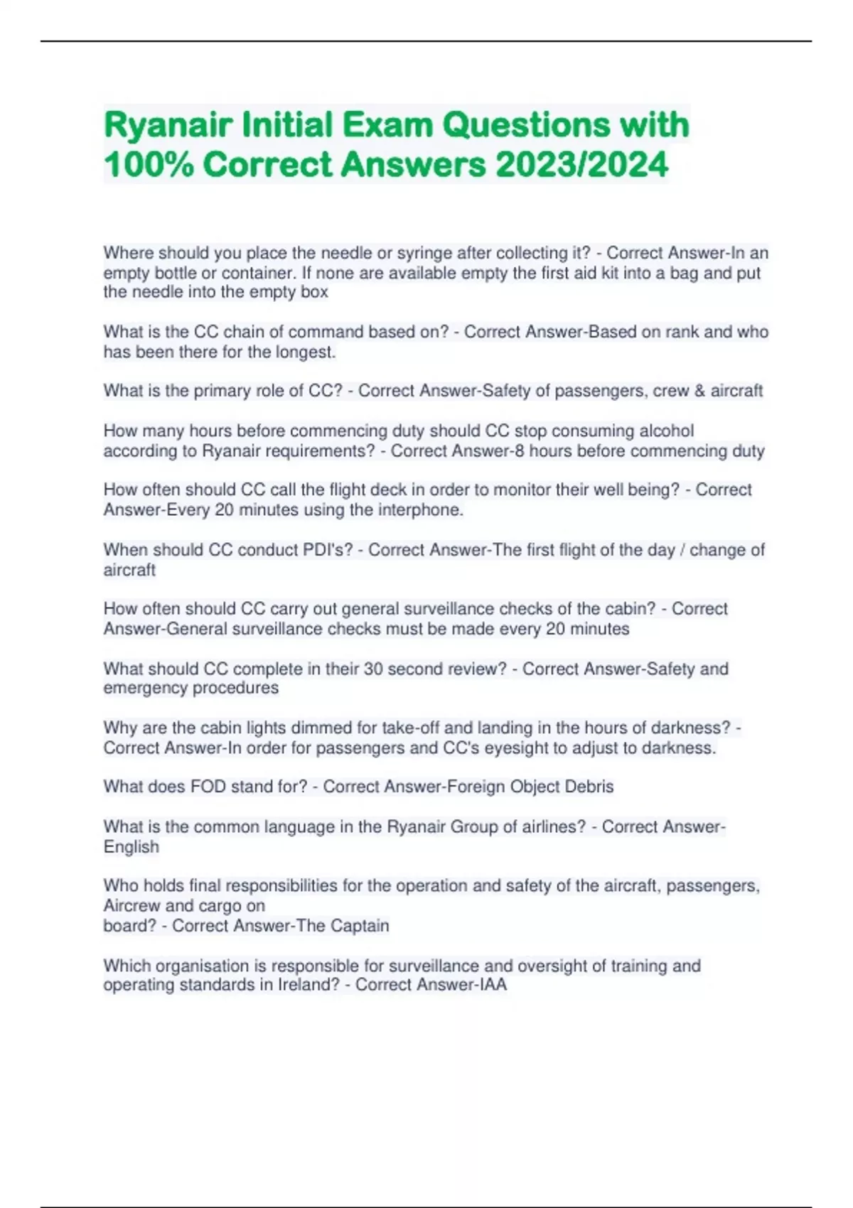 Ryanair Initial Exam Questions with 100% Correct Answers 2023/2024