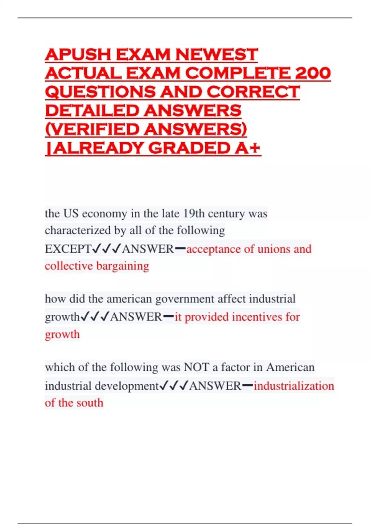 APUSH EXAM NEWEST ACTUAL EXAM COMPLETE 200 QUESTIONS AND CORRECT DETAILED ANSWERS (VERIFIED ANSWERS) |ALREADY GRADED A+ the US economy in the late 19th century was characterized by all of the following EXCEPTANSWERacceptance of unions and collective bargaining how did the american government affect industrial growthANSWERit provided incentives for growth which of the following was NOT a factor in American industrial developmentANSWERindustrialization of the south during the late 19th century, andrew carnegie created a vertically integrated company thatANSWERcontrolled every phase of the steel business from raw materials to distribution