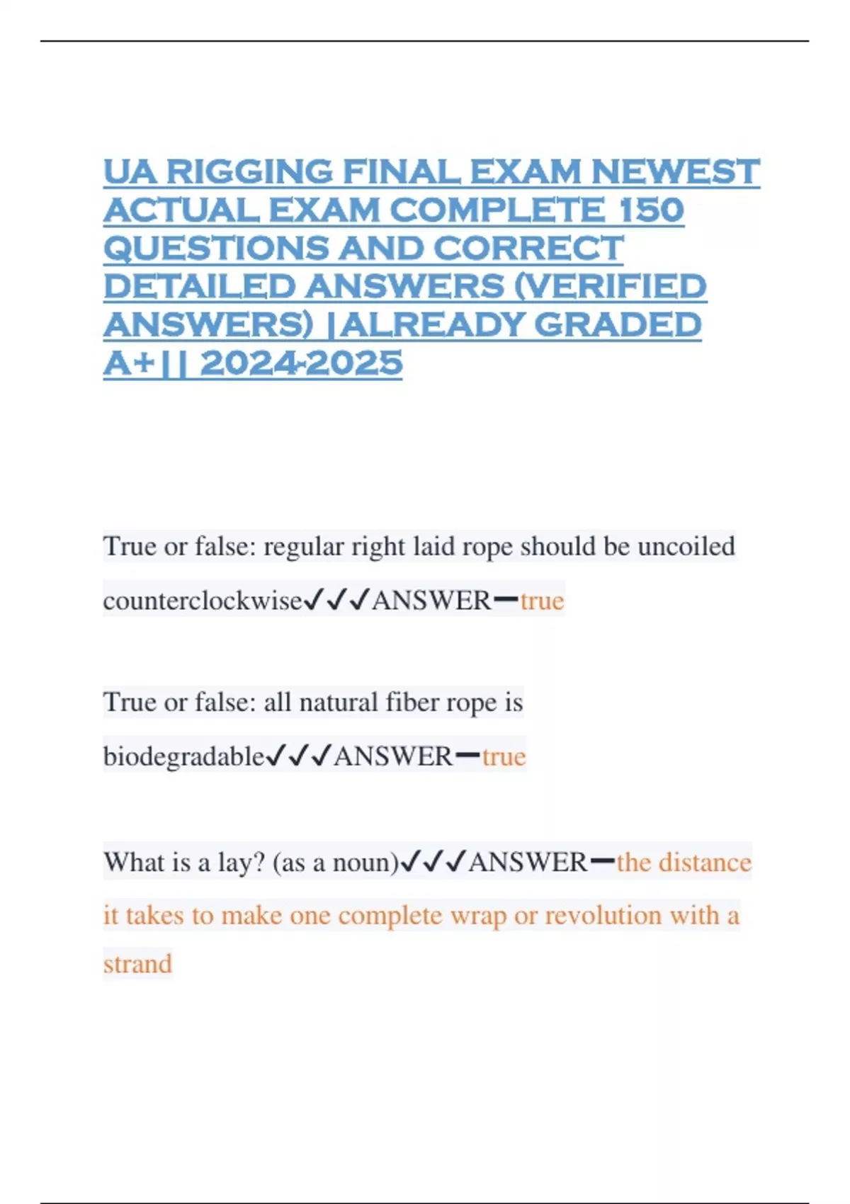 UA RIGGING FINAL EXAM NEWEST ACTUAL EXAM COMPLETE 150 QUESTIONS AND CORRECT DETAILED ANSWERS (VERIFIED ANSWERS) |ALREADY GRADED A+|| True or false: regular right laid rope should be uncoiled counterclockwiseANSWERtrue True or false: all natural fiber rope is biodegradableANSWERtrue What is a lay? (as a noun)ANSWERthe distance it takes to make one complete wrap or revolution with a strand if a rope breaks, you can tie the ends together with a square knot if it's a dry rope (t/f)ANSWERfalse, you must splice them into one piece after removing the bad section First grade or #1 manila can be identified by?ANSWERthe inner wound colored strip what is the strongest synthetic fiber rope mentioned in chapter 1?ANSWERnylon