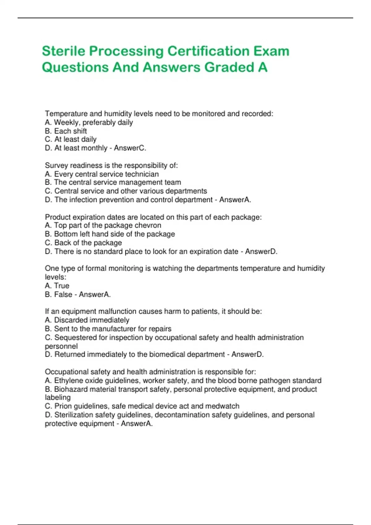 Sterile Processing Certification Exam Questions And Answers Graded A