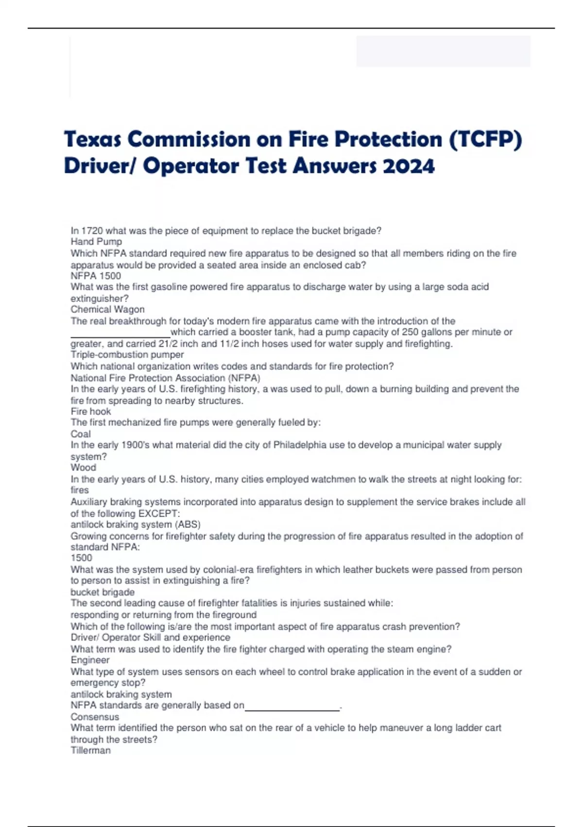 Texas Commission on Fire Protection (TCFP) Driver/ Operator Test Answers 2024