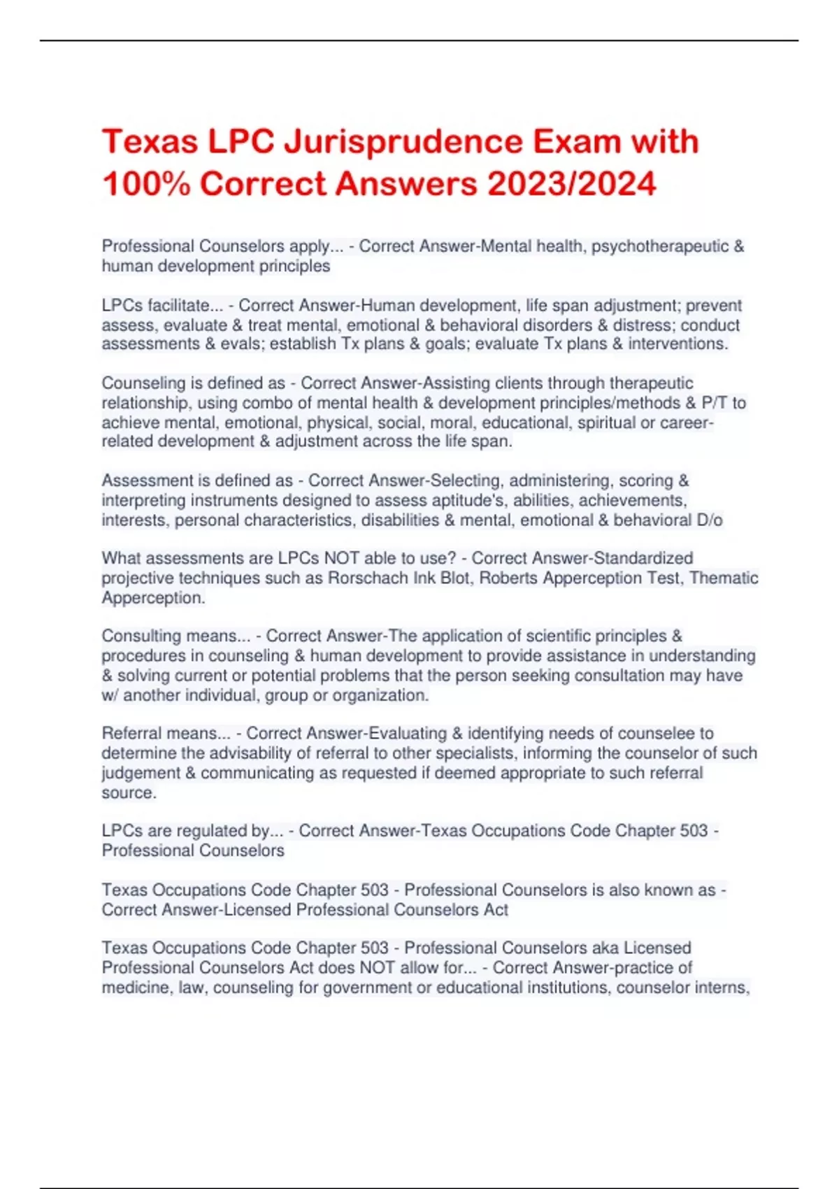 - Texas LPC Jurisprudence Exm with 100% orrect An