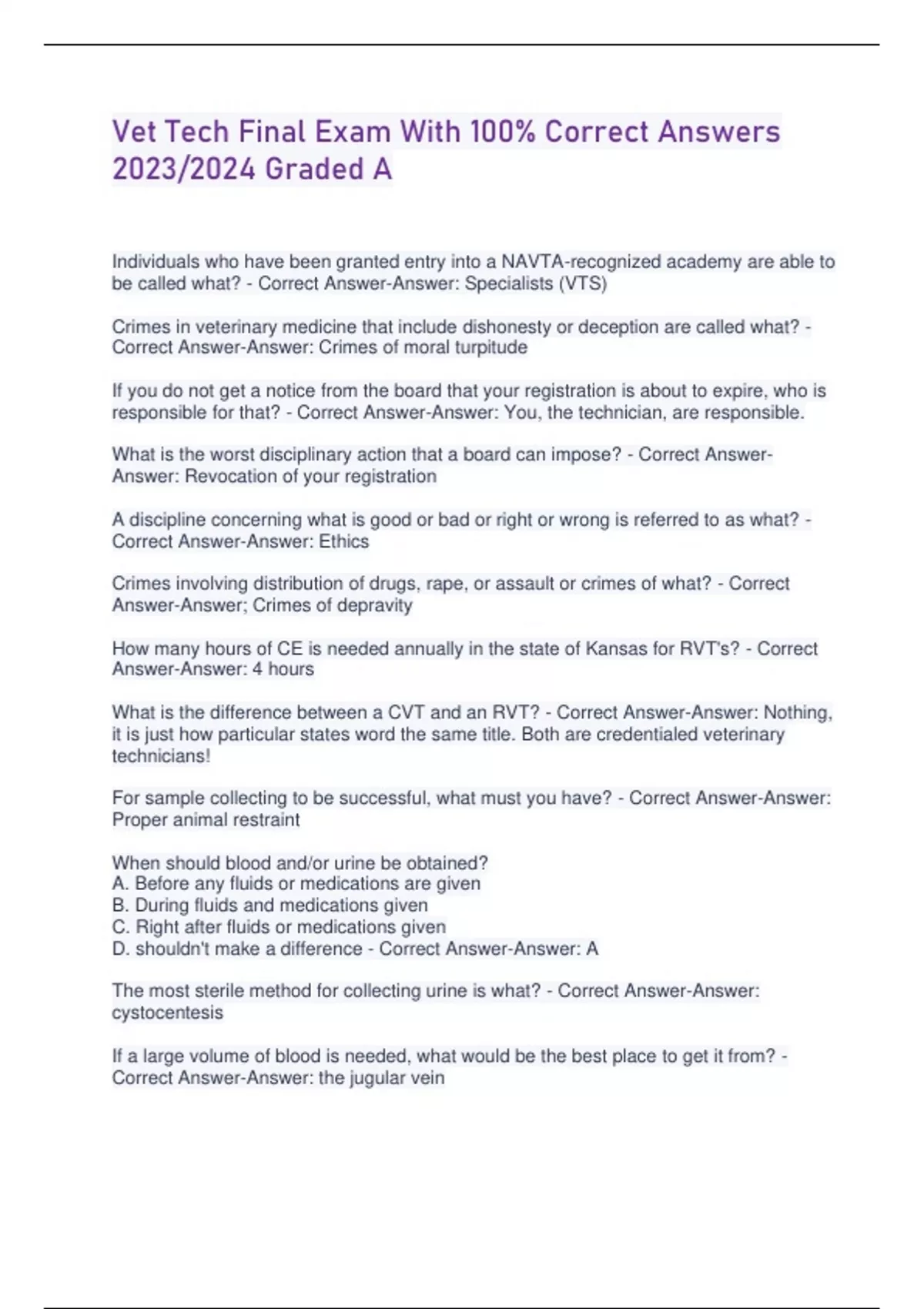 Vet Tech Final Exam With 100% Correct Answers 2023/2024 Graded