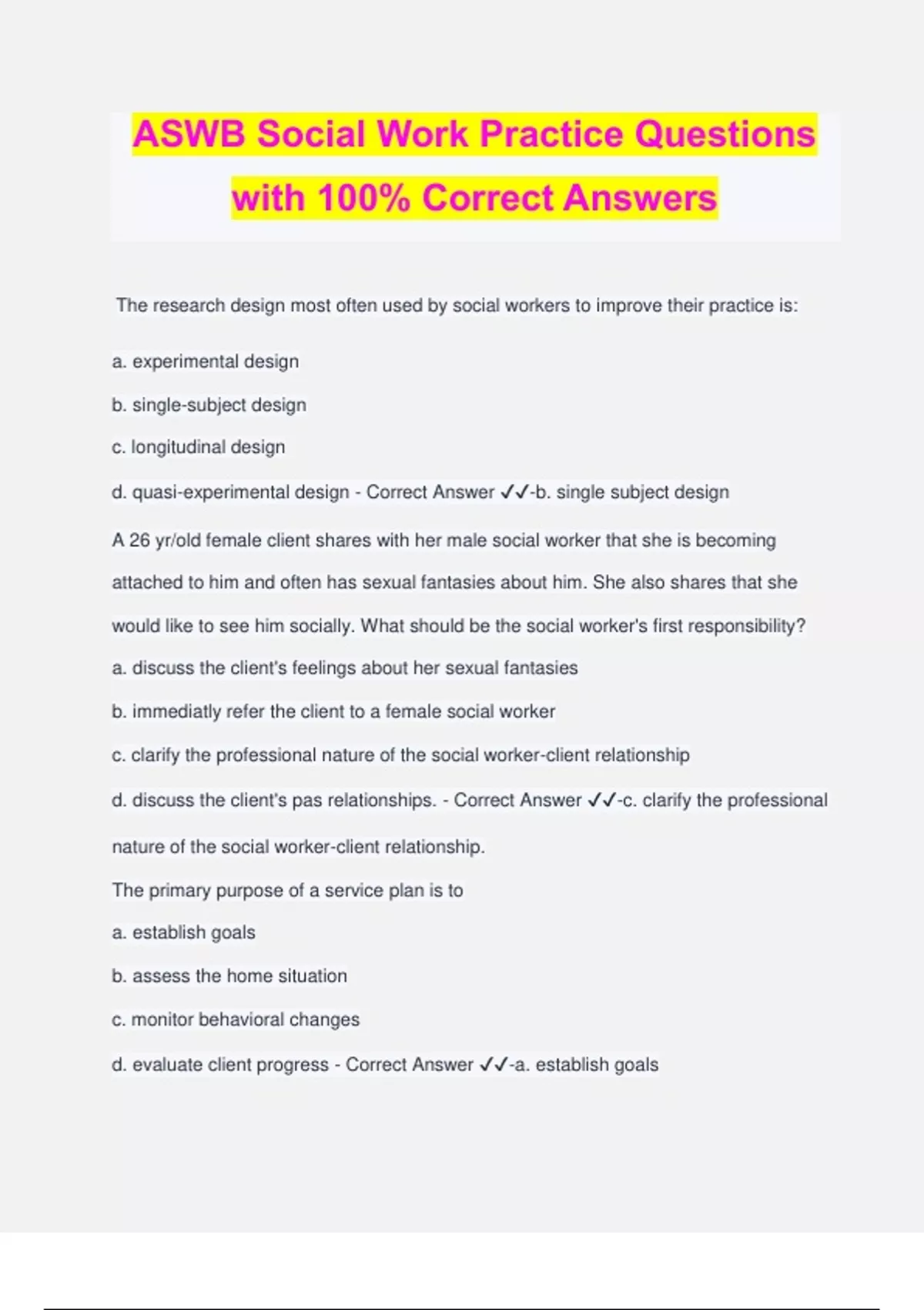 ASWB Social Work Practice Questions with 100% Correct Answers The research design most often used by social workers to improve their practice is: a. experimental design b. single-subject design c. longitudinal design d. quasi-experimental design - Correct Answer ️️ -b. single subject design A 26 yr/old female client shares with her male social worker that she is becoming attached to him and often has sexual fantasies about him. She also shares that she would like to see him socially. What should be the social worker's first responsibility? a. discuss the client's feelings about her sexual fantasies b. immediatly refer the client to a female social worker c. clarify the professional nature of the social worker-client relationship d. discuss the client's pas relationships. - Correct Answer ️️ -c. clarify the professional nature of the social worker-client relationship. The primary purpose of a service plan is to a. establish goals b. assess the home situation c. monitor behavioral changes d. evaluate client progress - Correct Answer ️️ -a. establish goals In treating a client in crisis, the caseworker should focus on... a. the immediate presenting problem b. a few specific problems in day-to-day functioning c. a wide range of problems in day to day functioning d. underlying personality problems - Correct Answer ️️ -a. the immediate presenting problem When faced by a hostile client in an agency setting, it is best for the social worker to a. suggest that the client's attitude is making the situation worse b. accept the client's hostility and talk about non-threatening topics c. set limits and structure on the interview session d. acknowledge the client's feelings and encourage discussion of them - Correct Answer ️️ -d. acknowledge the client's feelings and encourage discussion of them You are a social worker in an outpatient setting. A new client arrives for her first session with you. The client has noticeable hair loss and tells you that she is very tense and is having problems in her relationship with her boyfriend. Your first diagnosis would likely be A. Borderline personality disorder B. generalized anxiety disorder C. Schizophrenia D. Trichotillomania - Correct Answer ️️ -D. Trichotillomania A social worker who attempts to impose their judgement on clients is most likely to elicit the client's a. acquiescence b. cooperation c. resistance d. appreciation - Correct Answer ️️ -c. resistance Establishing rapport with a client is essential in the initial stages of counseling. All of the following techniques are effective except a. moderate levels of self-disclosure b. admitting your mistakes c. sharing personal experience d. responding to a client's nonverbal messages - Correct Answer ️️ -c. sharing personal experience A social worker meets with a refugee couple in the hospital soon after the birth of their baby. The infant has Down syndrome and cardiac problems. The couple asks that the child be allowed to die. The social worker should first: a. report the case ot child protection services becuause of the at-risk nature of the situation b. offer the parents the option of relinquishing the child for adoption c. encourage the parents to meet with other parents of Down syndrome children d. perform a biopsychosocial assessment including cultural, religious and familial factors. - Correct Answer ️️ -d. perform a biopsychosocial assessment including cultural, religious and familial factors The youngest child of a single parent is hospitalized for the second time in four months because of lead poisoning. The child is now ready for discharge, but the doctor refuses to go ahead with the release, citing an unsafe home environment. When intervie