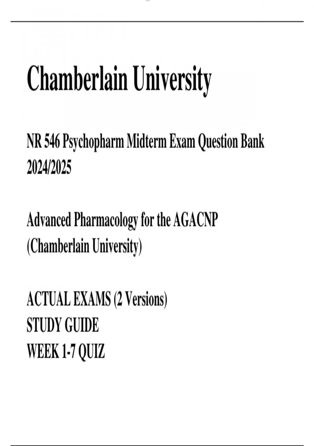 Chamberlain University NR 546 Psychopharm Midterm Exam Question Bank 2024/2025 Advanced Pharmacology for the AGACNP (Chamberlain University) ACTUAL EXAMS (2 Versions) STUDY GUIDE WEEK 1-7 QUIZ