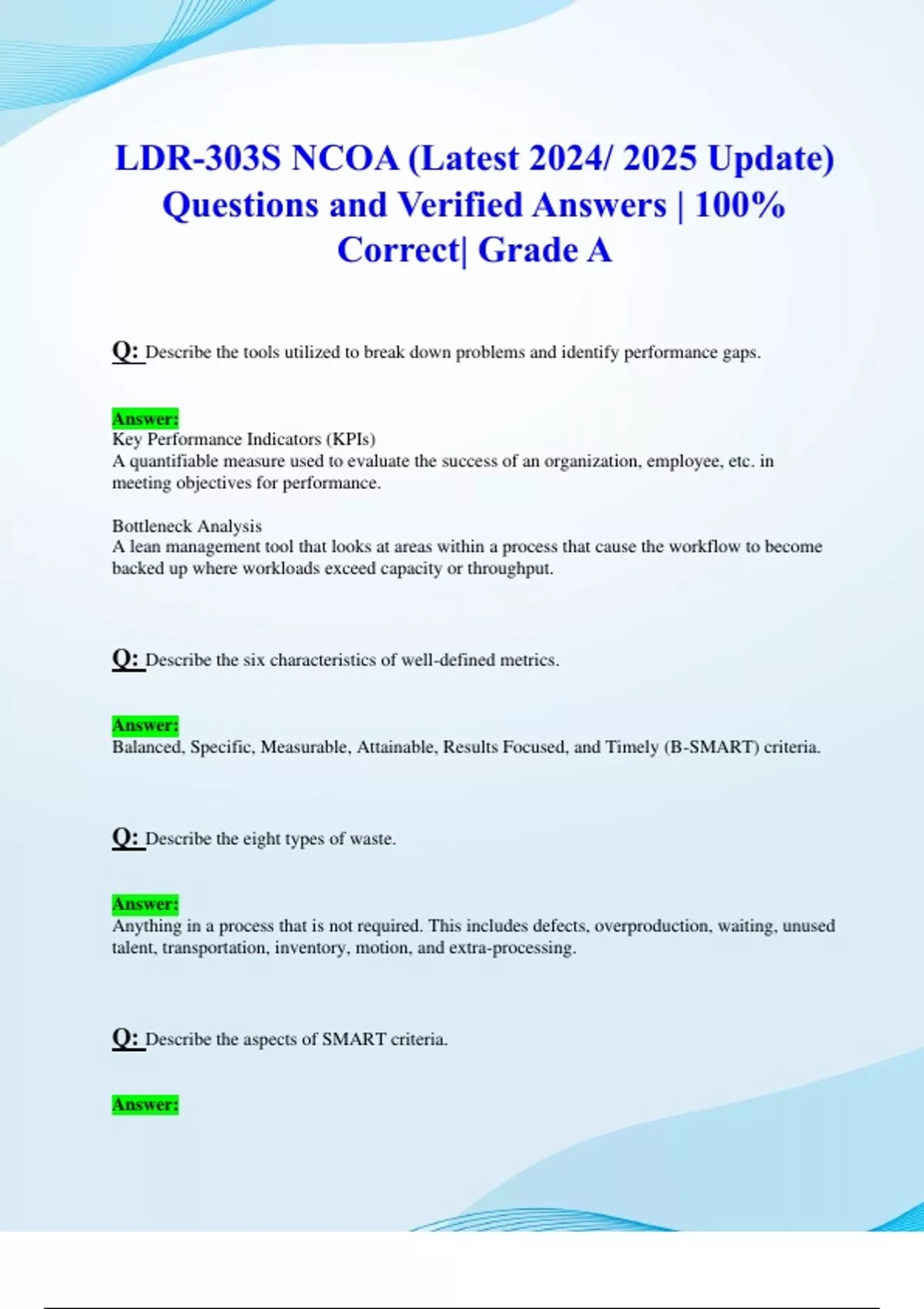 LDR-303S NCOA (Latest 2024/ 2025 Update) Questions and Verified Answers | 100% Correct| Grade A Q: Describe the tools utilized to break down problems and identify performance gaps. Answer: Key Performance Indicators (KPIs) A quantifiable measure used to evaluate the success of an organization, employee, etc. in meeting objectives for performance. Bottleneck Analysis A lean management tool that looks at areas within a process that cause the workflow to become backed up where workloads exceed capacity or throughput. Q: Describe the six characteristics of well-defined metrics. Answer: Balanced, Specific, Measurable, Attainable, Results Focused, and Timely (B-SMART) criteria. Q: Describe the eight types of waste. Answer: Anything in a process that is not required. This includes defects, overproduction, waiting, unused talent, transportation, inventory, motion, and extra-processing. Q: Describe the aspects of SMART criteria. Answer: specific- important- the less specific a goal the harder it will be to achieve measurable- what determines success actionable- how will the goal be achieved relavant- minimal effort maximum value time-bound- provides incentive and monitors progress Q: Describe various root cause analysis tools that assist in problem solving efforts. Answer: Brainstorming is an informal approach to problem-solving that encourages your team to come up with as many ideas as possible. 5 Whys method, you should be able to see how one process affects another, identify relationships between different causes, and get to the root cause(s) of problems. Pareto Analysis is a method based on the Pareto Principle (also known as the 80/20 Rule) - the idea that 80 percent of problems may be the result of as little as 20 percent of causes. Affinity Diagrams provide a flexible method for brainstorming and organizing ideas/information. It can be used to organize many different potential causes or issues together. Cause-and-Effect diagram, also known as a Fishbone or Ishikawa Diagram, is a visual tool that logically categorizes potential causes for a specific problem. It visually displays causes and provides details to see causal relationships. Control Chart is a statistical process control method that involves collecting and analyzing data about a process, checking for unexpected variations, and correcting any issues identified. Q: Explain how root cause analysis tools can assist in problem solving efforts in home organizations. Answer: Whether you are addressing problems at work or in your personal life, finding solutions to the root cause is imperative to ensure they are solved and stay solved. Reoccurring problems can waste time, money, and resources.