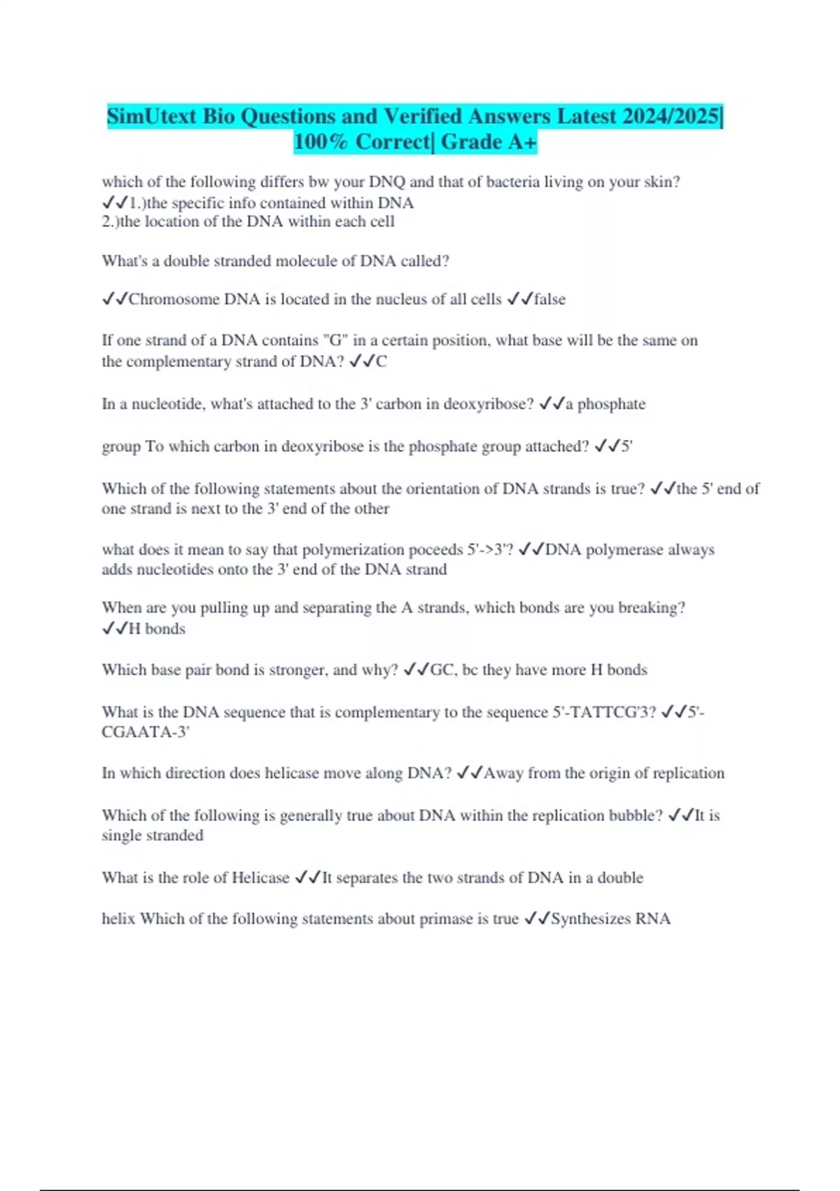 SimUtext Bio Questions and Verified Answers Latest 2024/2025| 100% Correct| Grade A+ which of the following differs bw your DNQ and that of bacteria living on your skin? 1.)the specific info contained within DNA 2.)the location of the DNA within each cell What's a double stranded molecule of DNA called? Chromosome DNA is located in the nucleus of all cells false If one strand of a DNA contains "G" in a certain position, what base will be the same on the complementary strand of DNA? C In a nucleotide, what's attached to the 3' carbon in deoxyribose? a phosphate group To which carbon in deoxyribose is the phosphate group attached? 5' Which of the following statements about the orientation of DNA strands is true? the 5' end of one strand is next to the 3' end of the other what does it mean to say that polymerization poceeds 5'->3'? DNA polymerase always adds nucleotides onto the 3' end of the DNA strand When are you pulling up and separating the A strands, which bonds are you breaking? H bonds Which base pair bond is stronger, and why? GC, bc they have more H bonds What is the DNA sequence that is complementary to the sequence 5'-TATTCG'3? 5'- CGAATA-3' In which direction does helicase move along DNA? Away from the origin of replication Which of the following is generally true about DNA within the replication bubble? It is single stranded What is the role of Helicase It separates the two strands of DNA in a double helix Which of the following statements about primase is true Synthesizes RNA