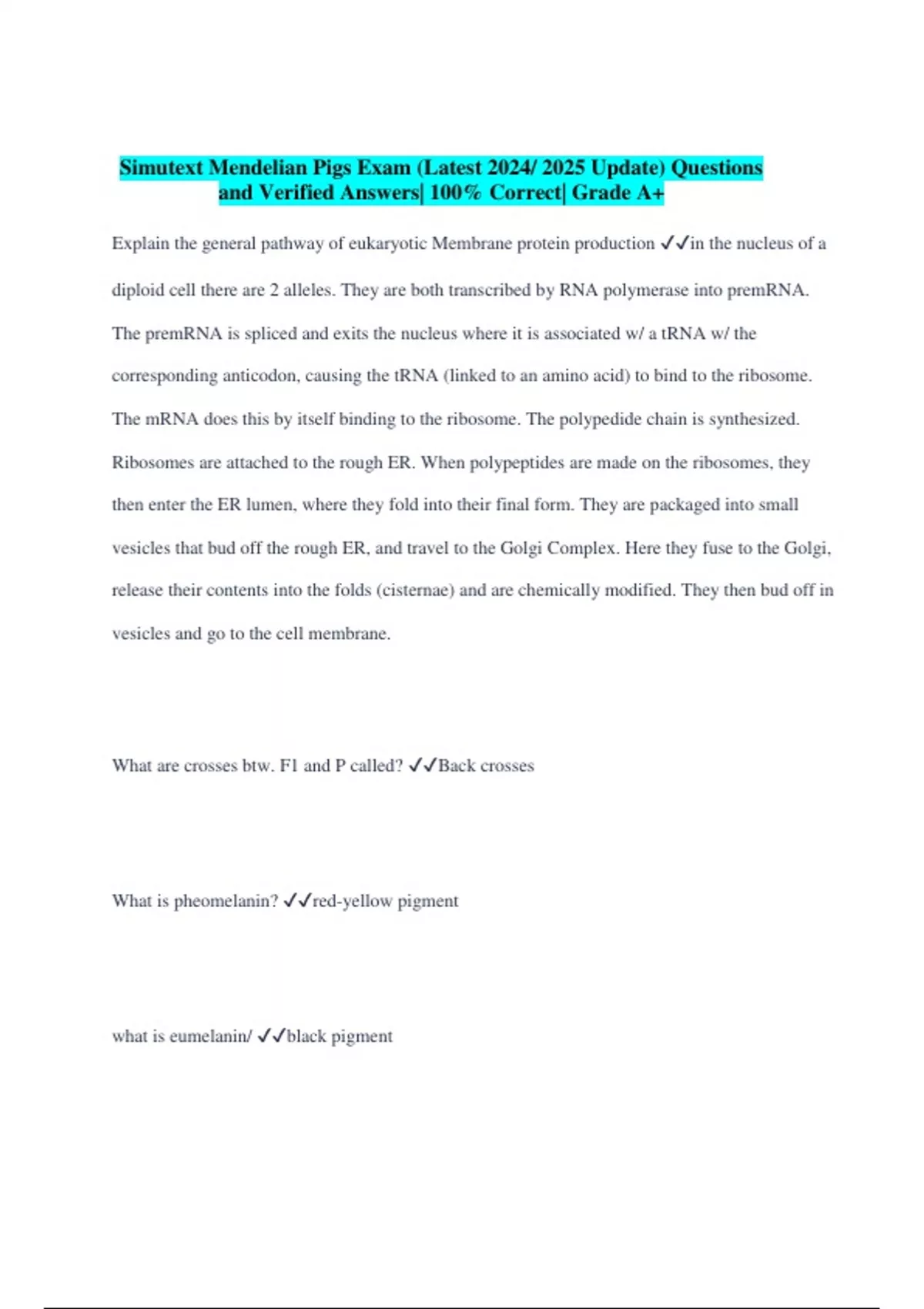 Simutext Mendelian Pigs Exam (Latest 2024/ 2025 Update) Questions and Verified Answers| 100% Correct| Grade A+ Explain the general pathway of eukaryotic Membrane protein production in the nucleus of a diploid cell there are 2 alleles. They are both transcribed by RNA polymerase into premRNA. The premRNA is spliced and exits the nucleus where it is associated w/ a tRNA w/ the corresponding anticodon, causing the tRNA (linked to an amino acid) to bind to the ribosome. The mRNA does this by itself binding to the ribosome. The polypedide chain is synthesized. Ribosomes are attached to the rough ER. When polypeptides are made on the ribosomes, they then enter the ER lumen, where they fold into their final form. They are packaged into small vesicles that bud off the rough ER, and travel to the Golgi Complex. Here they fuse to the Golgi, release their contents into the folds (cisternae) and are chemically modified. They then bud off in vesicles and go to the cell membrane. What are crosses btw. F1 and P called? Back crosses What is pheomelanin? red-yellow pigment what is eumelanin/ black pigment