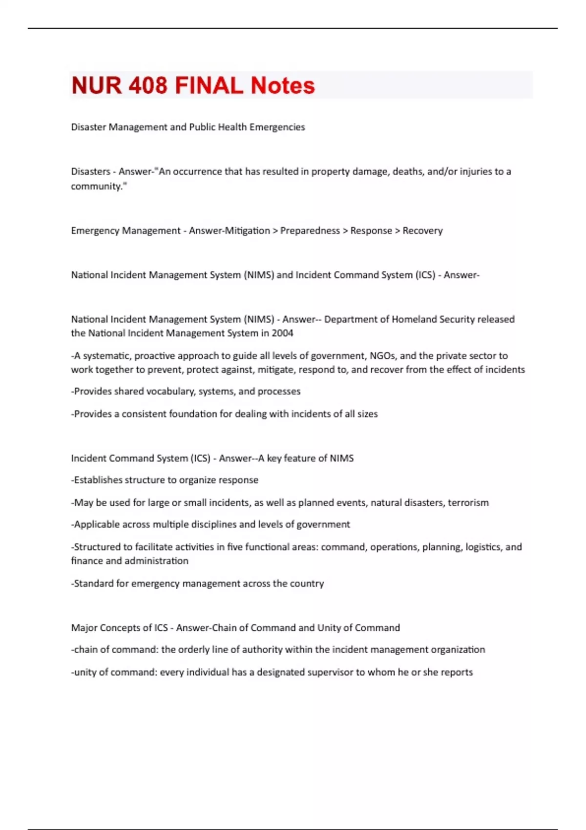 Disaster Management and Public Health Emergencies Disasters - Answer-"An occurrence that has resulted in property damage, deaths, and/or injuries to a community." Emergency Management - Answer-Mitigation > Preparedness > Response > Recovery National Incident Management System (NIMS) and Incident Command System (ICS) - AnswerNational Incident Management System (NIMS) - Answer-- Department of Homeland Security released the National Incident Management System in 2004 -A systematic, proactive approach to guide all levels of government, NGOs, and the private sector to work together to prevent, protect against, mitigate, respond to, and recover from the effect of incidents -Provides shared vocabulary, systems, and processes -Provides a consistent foundation for dealing with incidents of all sizes Incident Command System (ICS) - Answer--A key feature of NIMS -Establishes structure to organize response -May be used for large or small incidents, as well as planned events, natural disasters, terrorism -Applicable across multiple disciplines and levels of government -Structured to facilitate activities in five functional areas: command, operations, planning, logistics, and finance and administration -Standard for emergency management across the country Major Concepts of ICS - Answer-Chain of Command and Unity of Command -chain of command: the orderly line of authority within the incident management organization -unity of command: every individual has a designated supervisor to whom he or she reportsSpan of Control -the span of control of any individual with incident management supervisory responsibility should range from 3-7 subordinates Management by Objectives -ensures specific, measurable objectives and efforts to attain them Modular Organization -can scale up or down based on size and complexity Incident Action Planning -provides a standard mechanism for communicating overall incident objectives Common Terminology -common terms are used to define organizational functions, incident facilities, resources, and position titles Resource Management -maintaining an accurate picture of resource utilization is a critical component of incident management ICS Organizational Structure and Sections - Answer-Operations: -responsible for all tactical activities Planning: -collects, evaluates and disseminates incident information to the IC and incident management personnel Logistics: -responsible for all service support requirements needed to facilitate responseFinance/Administration -responsible for recording staff time, maintaining vendor contracts, administering compensation Public Health Emergencies and Philadelphia Department of Public Health - AnswerWhat is a Public Health Emergency? - Answer-A public health emergency is an event that threatens to overwhelm routine public health and healthcare activities due to scale, severity, timing, or unpredictability Public Health Emergencies - Answer-Outbreak of novel or severe disease -SARS -Ebola -Pandemic influenza Terrorist Attack -Biological agent -Chemical agent -Bombing Radiological Event Severe Weather Events -Coastal storm -Extreme heat Environmental