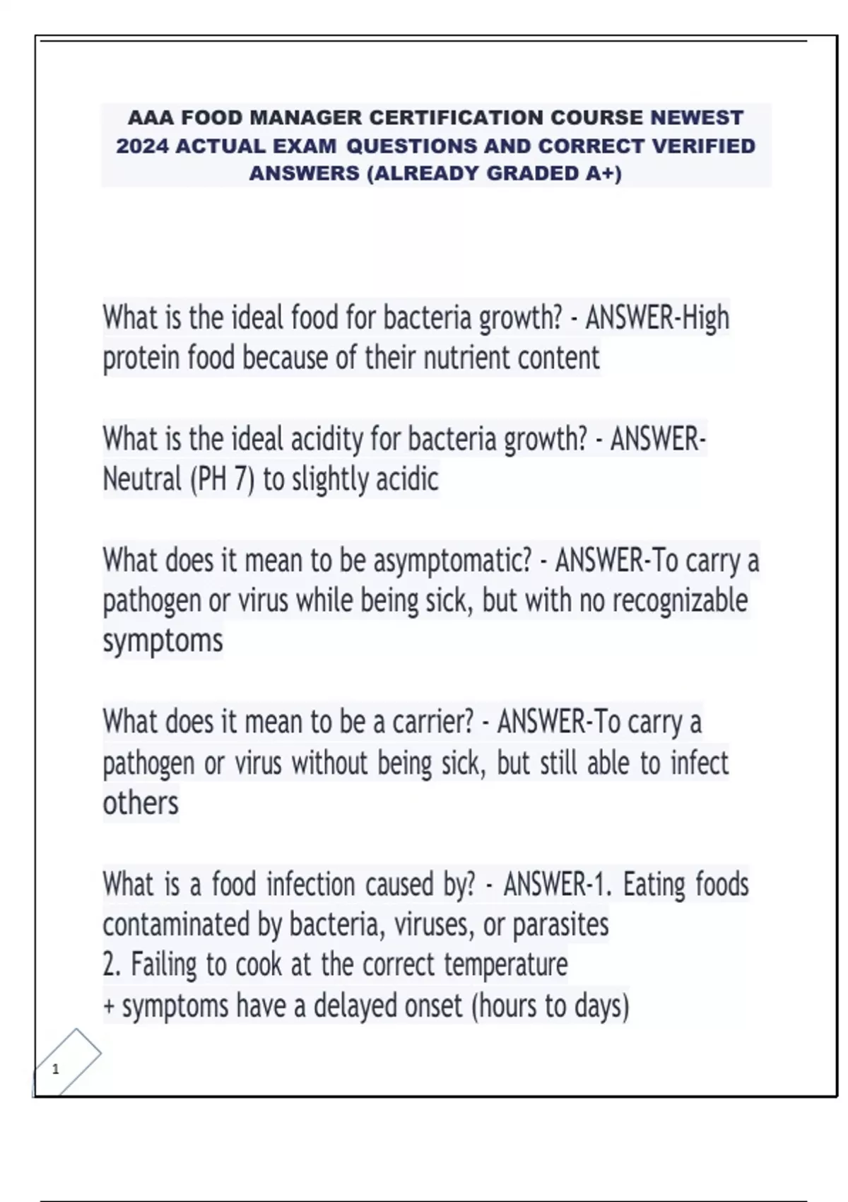 AAA FOOD MANAGER CERTIFICATION COURSE NEWEST 2024 ACTUAL EXAM QUESTIONS AND CORRECT VERIFIED ANSWERS What is the ideal food for bacteria growth? - ANSWER-High protein food because of their nutrient content What is the ideal acidity for bacteria growth? - ANSWERNeutral (PH 7) to slightly acidic What does it mean to be asymptomatic? - ANSWER-To carry a pathogen or virus while being sick, but with no recognizable symptoms What does it mean to be a carrier? - ANSWER-To carry a pathogen or virus without being sick, but still able to infect others What is a food infection caused by? - ANSWER-1. Eating foods contaminated by bacteria, viruses, or parasites 2. Failing to cook at the correct temperature + symptoms have a delayed onset (hours to days) AAA FOOD MANAGER CERTIFICATION COURSE NEWEST 2024 ACTUAL EXAM QUESTIONS AND CORRECT VERIFIED ANSWERS (ALREADY GRADED A+) 1 What is food intoxication caused by? - ANSWER-1. Eating foods contaminated by toxins + symptoms show up quickly (few hours) Who is most likely to get sick? - ANSWER-Young children, pregnant women, sickly people (HIV/AIDS/Organ transplant), elderly, and immunocompromised people How does food become unsafe? - ANSWER-1. Purchasing food from unapproved sources 2. Failing to cook food correctly/in an unapproved location 3. Holding food at incorrect temperatures 4. Through cross contamination 5. Practicing poor personal hygiene What is the FDA (Food and Drug Administration)? - ANSWERAn agency in charge of ensuring the safety of all foods sold 2 except meat, poultry, and seafood + they regulate food transport across state lines and writes the food code What is the USDA (United States Department of Agriculture)? - ANSWER-An agency that inspects meat, poultry, and eggs + they regulate food transport across state lines