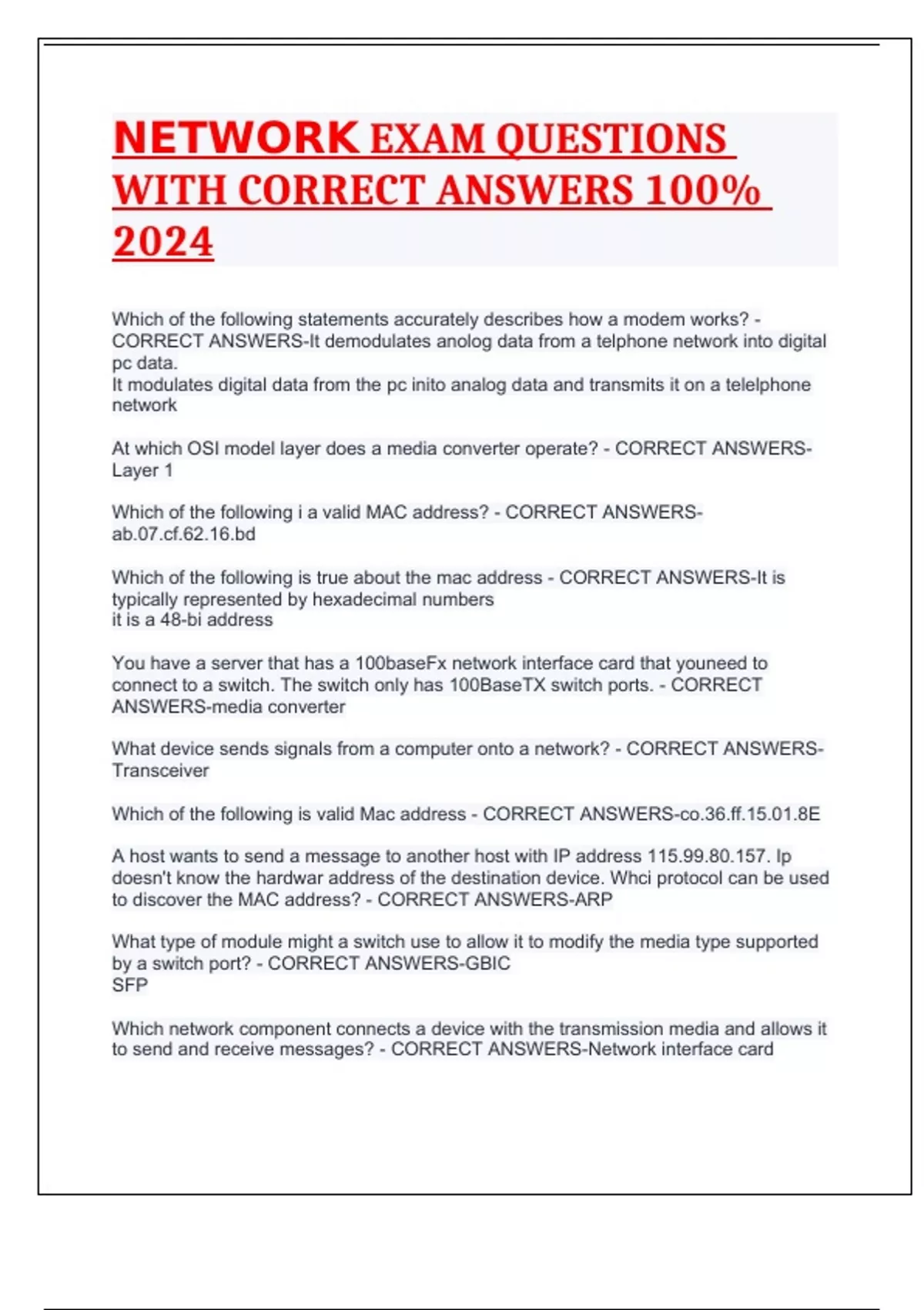 NETWORK EXA M QUESTIONS WITH CORRECT ANSWERS 100% 2024