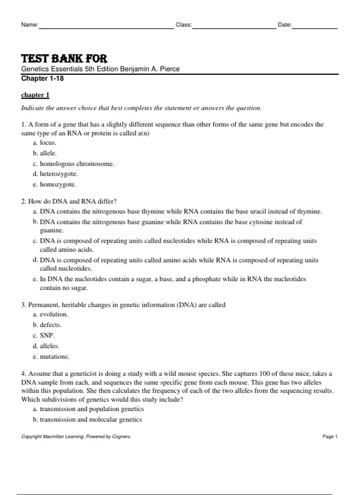 Test Bank For Genetics Essentials 5th Edition by Benjamin A. Pierce Chapter 1-18