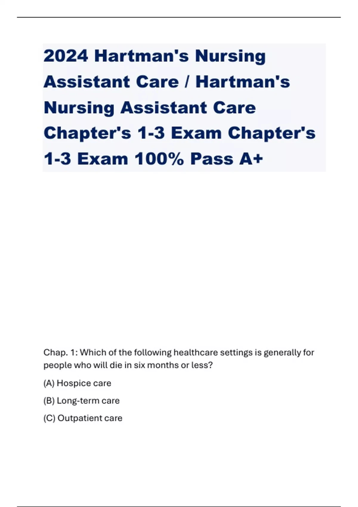2024 Hartman's Nursing Assistant Care / Hartman's Nursing Assistant Care Chapter's 1-3 Exam Chapter's 1-3 Exam 100% Pass A+