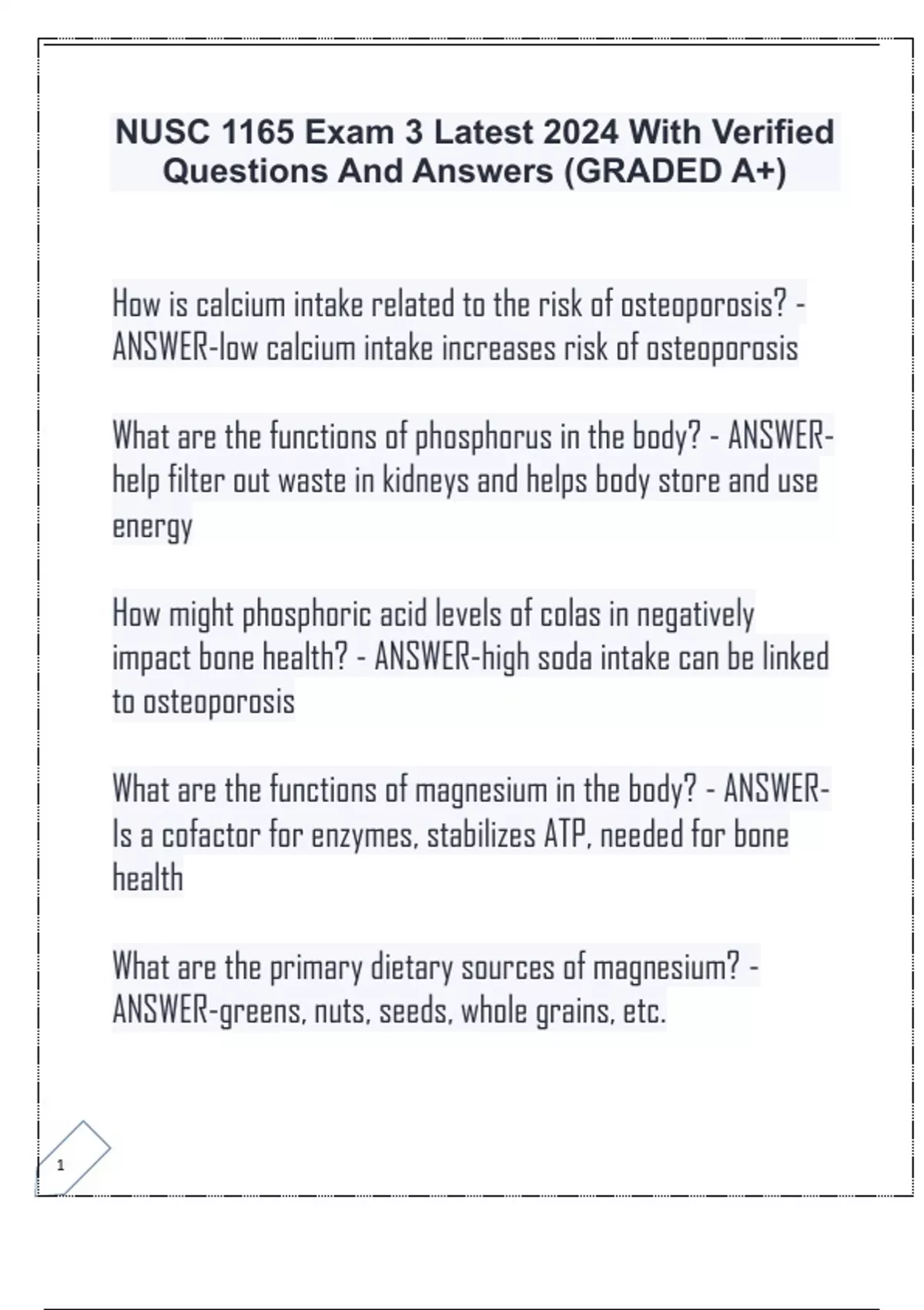 NUSC 1165 Exam 3 Latest 2024 With Verified Questions And Answers (GRADED A+) How is calcium intake related to the risk of osteoporosis? - ANSWER-low calcium intake increases risk of osteoporosis What are the functions of phosphorus in the body? - ANSWERhelp filter out waste in kidneys and helps body store and use energy How might phosphoric acid levels of colas in negatively impact bone health? - ANSWER-high soda intake can be linked to osteoporosis What are the functions of magnesium in the body? - ANSWERIs a cofactor for enzymes, stabilizes ATP, needed for bone health What are the primary dietary sources of magnesium? - ANSWER-greens, nuts, seeds, whole grains, etc. 2 Are trace elements/minerals as important as major minerals in the body? - ANSWER-they are equally important, but trace minerals are needed in smaller amounts than major minerals. Which trace mineral is a component of hemoglobin? Why is hemoglobin important in the body? - ANSWER-iron; carries oxygen to your body's organs and tissues and transports carbon dioxide from your organs and tissues back to your lungs What is the major route of iron loss from our body? - ANSWER-bleeding How does vitamin C act as an antioxidant? - ANSWER-helps protect your cells against the effects of free radicals and oxidative stress