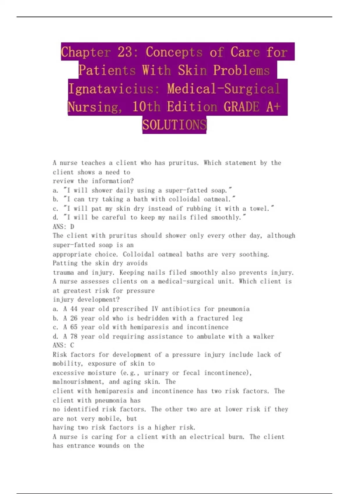 Chapter 23: Concepts of Care for Patients With Skin Problems Ignatavicius: Medical-Surgical Nursing, 10th Edition GRADE A+ SOLUTIONS