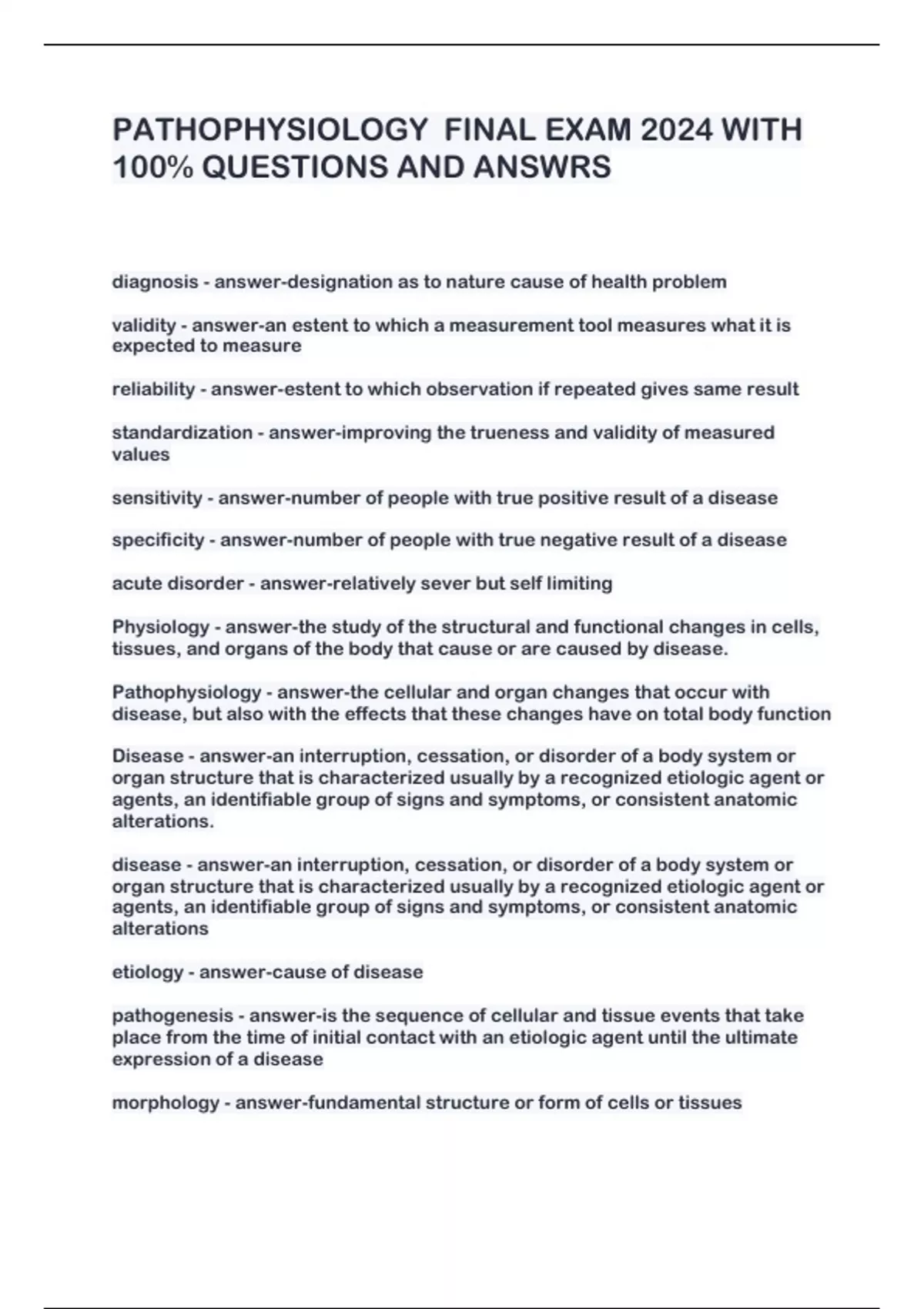PATHOPHYSIOLOGY FINAL EXAM 2024 WITH 100% QUESTIONS AND ANSWRS diagnosis - answer-designation as to nature cause of health problem validity - answer-an estent to which a measurement tool measures what it is expected to measure reliability - answer-estent to which observation if repeated gives same result standardization - answer-improving the trueness and validity of measured values sensitivity - answer-number of people with true positive result of a disease specificity - answer-number of people with true negative result of a disease acute disorder - answer-relatively sever but self limiting Physiology - answer-the study of the structural and functional changes in cells, tissues, and organs of the body that cause or are caused by disease. Pathophysiology - answer-the cellular and organ changes that occur with disease, but also with the effects that these changes have on total body function Disease - answer-an interruption, cessation, or disorder of a body system or organ structure that is characterized usually by a recognized etiologic agent or agents, an identifiable group of signs and symptoms, or consistent anatomic alterations. disease - answer-an interruption, cessation, or disorder of a body system or organ structure that is characterized usually by a recognized etiologic agent or agents, an identifiable group of signs and symptoms, or consistent anatomic alterations etiology - answer-cause of disease pathogenesis - answer-is the sequence of cellular and tissue events that take place from the time of initial contact with an etiologic agent until the ultimate expression of a disease