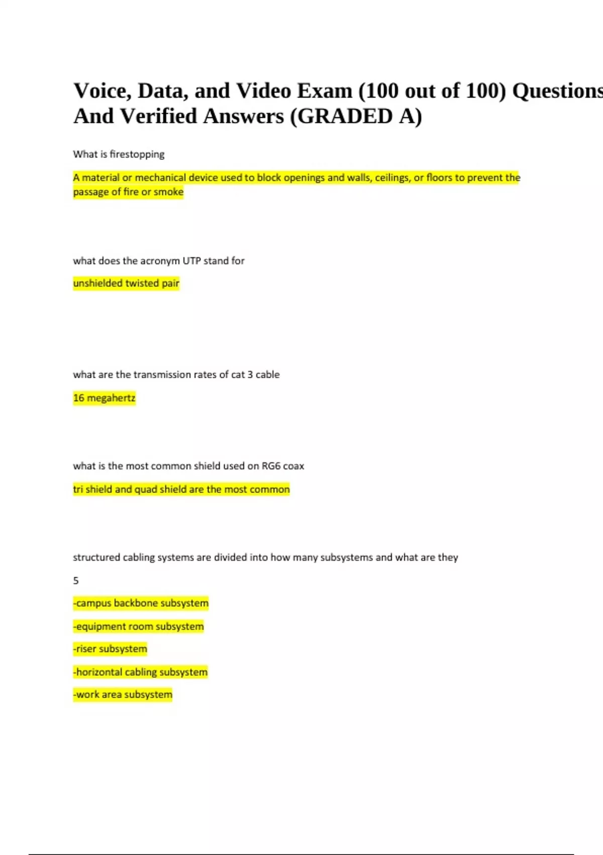 Voice, Data, and Video Exam (100 out of 100) Questions And Verified Answers (GRADED A). What is firestopping A material or mechanical device used to block openings and walls, ceilings, or floors to prevent the passage of fire or smoke what does the acronym UTP stand for unshielded twisted pair what are the transmission rates of cat 3 cable 16 megahertz what is the most common shield used on RG6 coax tri shield and quad shield are the most common structured cabling systems are divided into how many subsystems and what are they 5 -campus backbone subsystem -equipment room subsystem -riser subsystem -horizontal cabling subsystem -work area subsystem.