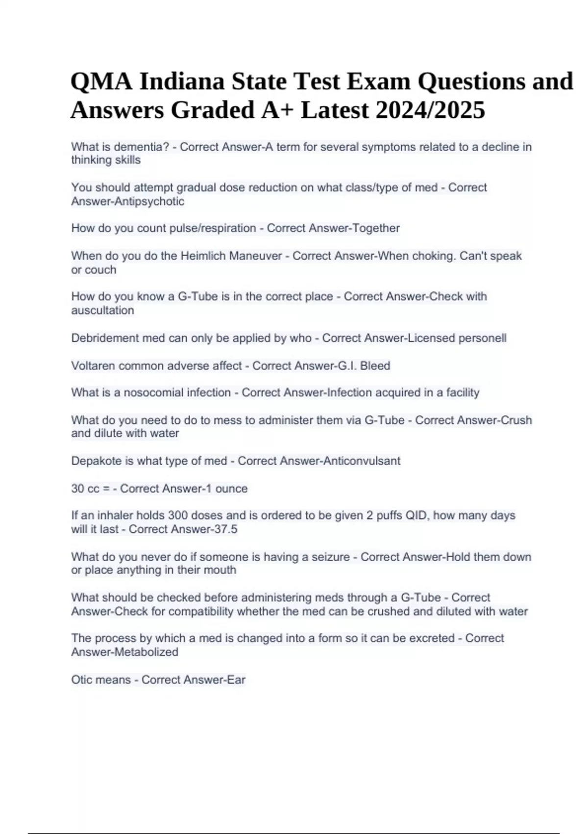 QMA Indiana State Test Exam Questions and Answers Graded A+ Latest 2024/2025. What is dementia? - Correct Answer-A term for several symptoms related to a decline in thinking skills You should attempt gradual dose reduction on what class/type of med - Correct Answer-Antipsychotic How do you count pulse/respiration - Correct Answer-Together When do you do the Heimlich Maneuver - Correct Answer-When choking. Can't speak or couch How do you know a G-Tube is in the correct place - Correct Answer-Check with auscultation Debridement med can only be applied by who - Correct Answer-Licensed personell Voltaren common adverse affect - Correct Answer-G.I. Bleed What is a nosocomial infection - Correct Answer-Infection acquired in a facility What do you need to do to mess to administer them via G-Tube - Correct Answer-Crush and dilute with water Depakote is what type of med - Correct Answer-Anticonvulsant 30 cc = - Correct Answer-1 ounce If an inhaler holds 300 doses and is ordered to be given 2 puffs QID, how many days will it last - Correct Answer-37.5 What do you never do if someone is having a seizure - Correct Answer-Hold them down or place anything in their mouth What should be checked before administering meds through a G-Tube - Correct Answer-Check for compatibility whether the med can be crushed and diluted with water The process by which a med is changed into a form so it can be excreted - Correct Answer-Metabolized Otic means - Correct Answer-Ear QMA Indiana State Test Exam Questions and Answers Graded A+ Latest 2024/2025 Blurred vision and yellow-green halls are side effects of what drug - Correct AnswerDigoxin A symptom of hyperglycemia - Correct Answer-Extreme thirst What affects med absorption - Correct Answer-Route, dosage, chemical composition form What is the average adult respiration rate - Correct Answer-12-20 B/p dropping after standing up is a side effect of what - Correct Answer-Sinemet What type of med is used to treat thrombophlebitis - Correct Answer-Coumadin, blood thinners How is Micronase classified - Correct Answer-Hypoglycemia What are anti-inflammatory med used for - Correct Answer-Decrease swelling and pain What class of med is aldactone - Correct Answer-Diuretic What three things do you observe a resident for that is receiving steroid meds - Correct Answer-Infection, weight gain, osteoporosis What is a common adverse effect of vasotec - Correct Answer-Dizziness, weakness, dry cough Mixture with a fat base - Correct Answer-Emulsion Cortisporin otic is used to treat what - Correct Answer-Ear infection (otitis media) What do you need to observe/monitor for when administering anticoagulants - Correct Answer-Bleeding How is prednisone classified - Correct Answer-Anti inflammatory How is Thorazine classified - Correct Answer-Antipsychotic What might a person have after taking nitroglycerin - Correct Answer-Flushing and palpitation What type or class of med is used to treat glaucoma - Correct Answer-Beta blockers What do you give to someone with menieres disease - Correct Answer-Meclizine, antivert .