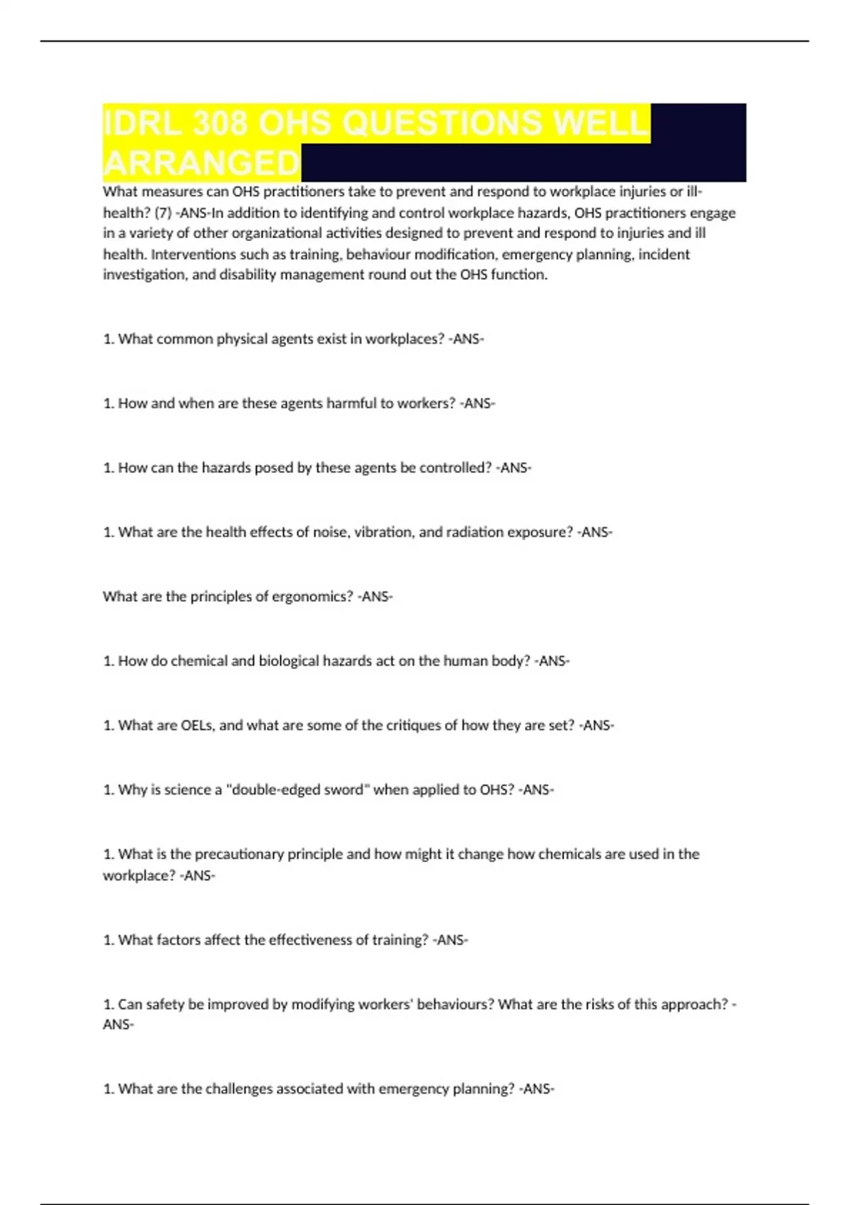 IDRL 308 OHS QUESTIONS WELL ARRANGED