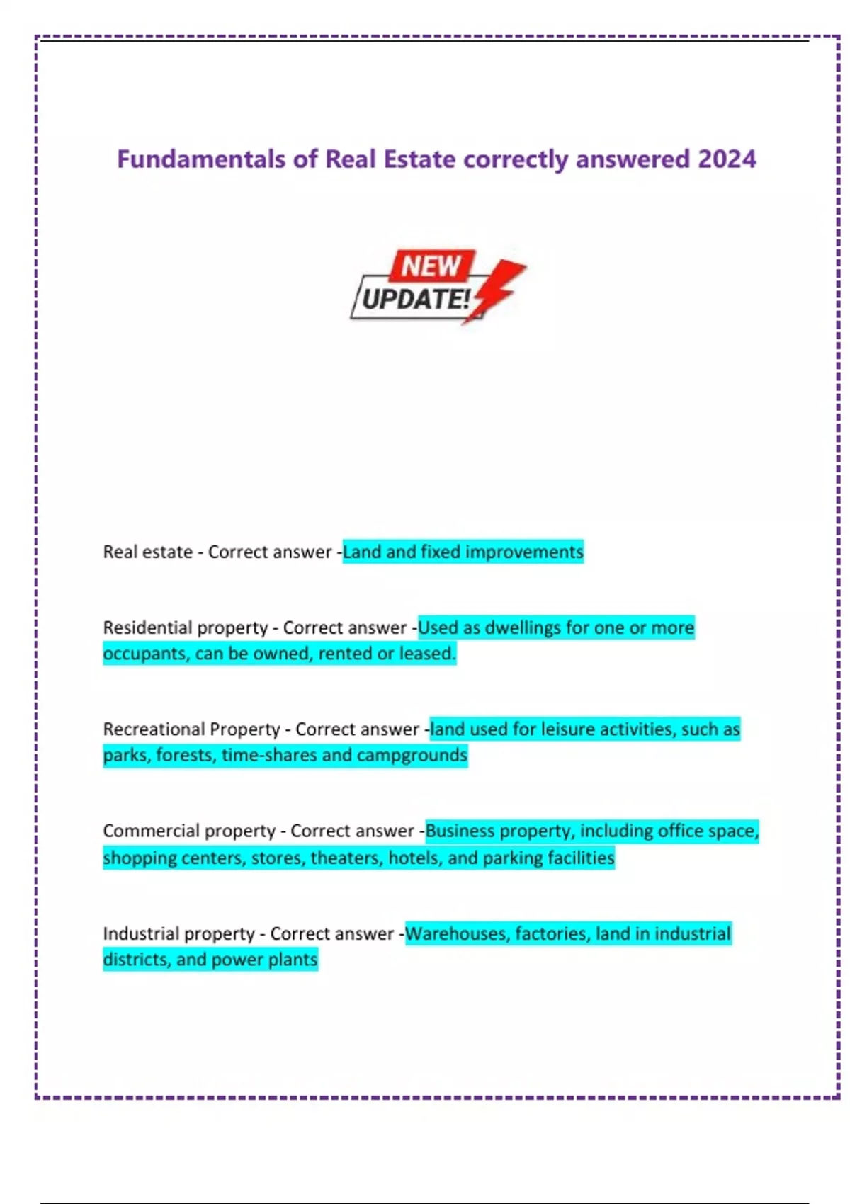 Real estate - Correct answer -Land and fixed improvements Residential property - Correct answer -Used as dwellings for one or more occupants, can be owned, rented or leased. Recreational Property - Correct answer -land used for leisure activities, such as parks, forests, time-shares and campgrounds Commercial property - Correct answer -Business property, including office space, shopping centers, stores, theaters, hotels, and parking facilities Industrial property - Correct answer -Warehouses, factories, land in industrial districts, and power plants