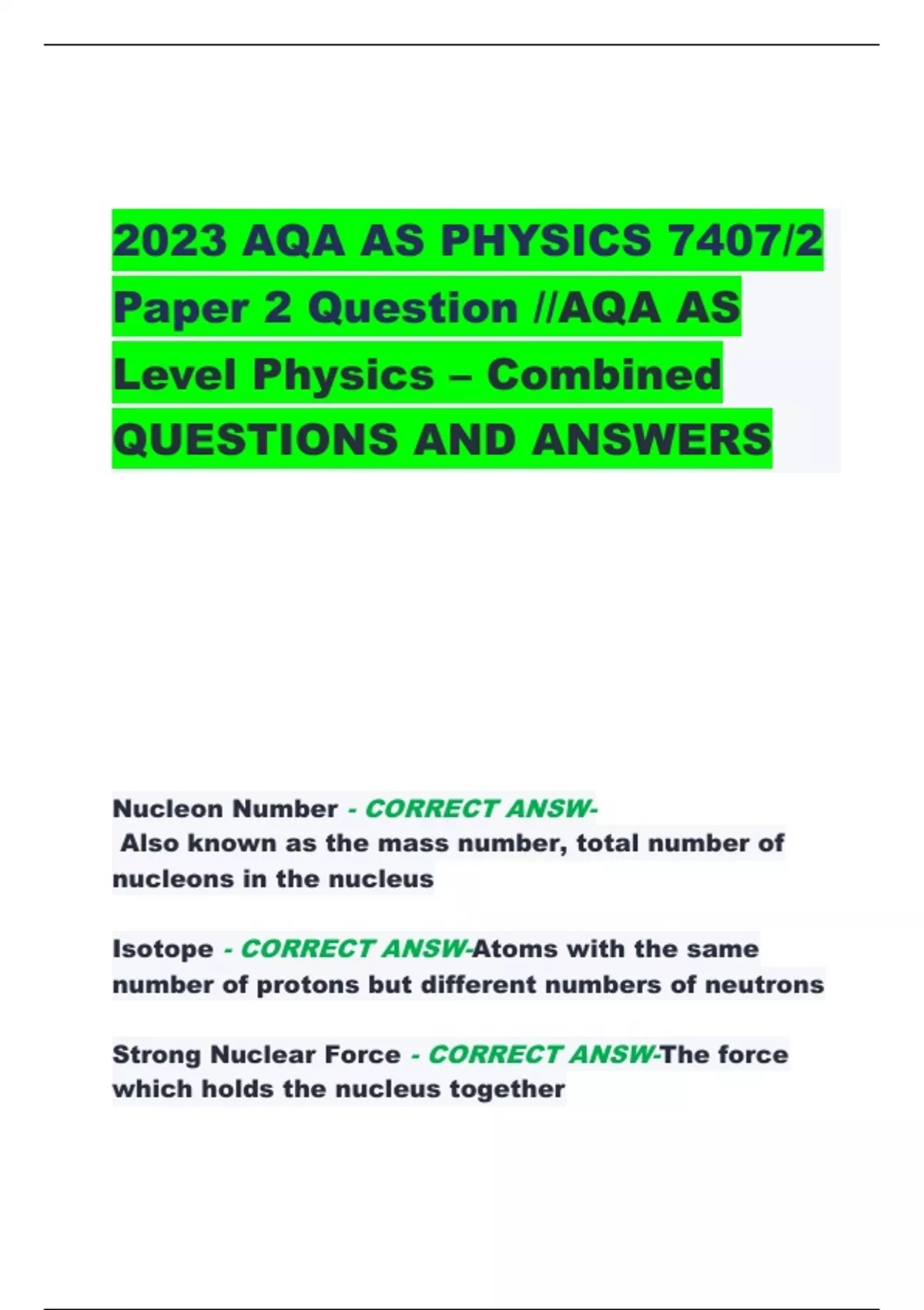 2023 AQA AS PHYSICS 7407/2 Paper 2 Question //AQA AS Level Physics – Combined QUESTIONS AND ANSWERS Nucleon Number - CORRECT ANSWAlso known as the mass number, total number of nucleons in the nucleus Isotope - CORRECT ANSW-Atoms with the same number