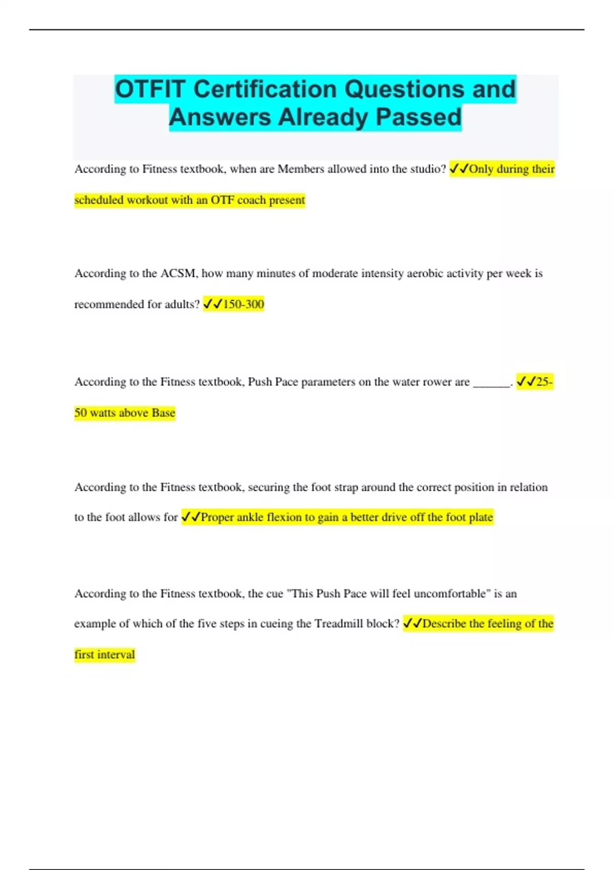 OTFIT Certification Questions and Answers Already Passed According to Fitness textbook, when are Members allowed into the studio? Only during their scheduled workout with an OTF coach present According to the ACSM, how many minutes of moderate intensity aerobic activity per week is recommended for adults? 150-300 According to the Fitness textbook, Push Pace parameters on the water rower are ______. 25- 50 watts above Base According to the Fitness textbook, securing the foot strap around the correct position in relation to the foot allows for Proper ankle flexion to gain a better drive off the foot plate According to the Fitness textbook, the cue "This Push Pace will feel uncomfortable" is an example of which of the five steps in cueing the Treadmill block? Describe the feeling of the first interval According to the Fitness Textbook, the type of rower is characterized by a common error in the 3x3 concept when a Member does not move his/her core through the proper range of motion and remains upright the entire time. The 12 o'clock straight up According to the Fitness textbook, this cue "Power walkers at 6% or greater" is an example of which of the five steps in cueing the Treadmill block? Provide the parameters of the interval According to the Fitness Textbook, what is an appropriate cue for Base Pace? This is your active recovery According to the fitness textbook, what is meant by "pairing intervals?" Providing the upcoming two intervals before they begin so members mentally prepare According to the Fitness textbook, what is one benefit of the OTconnect screen? It shows the individual real time data to Members about their performance According to the Fitness textbook, what is one of the first physiological responses that a Member may experience when beginning an exercise routine? increased water retention According to the Fitness textbook, what is the definition of static stretching? Involves slowly stretching a muscle/tendon group to the point of slight tension