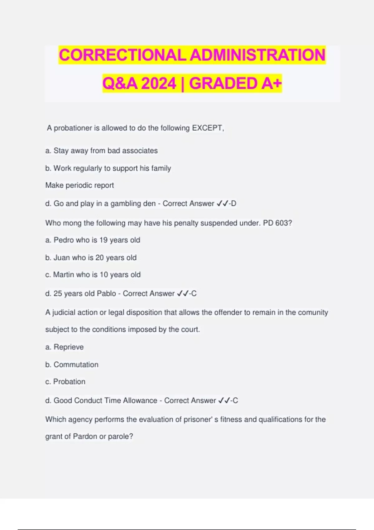 CORRECTIONAL ADMINISTRATION Q&A 2024 | GRADED A+ A probationer is allowed to do the following EXCEPT, a. Stay away from bad associates b. Work regularly to support his family Make periodic report d. Go and play in a gambling den - Correct Answer ️️ -D Who mong the following may have his penalty suspended under. PD 603? a. Pedro who is 19 years old b. Juan who is 20 years old c. Martin who is 10 years old d. 25 years old Pablo - Correct Answer ️️ -C A judicial action or legal disposition that allows the offender to remain in the comunity subject to the conditions imposed by the court. a. Reprieve b. Commutation c. Probation d. Good Conduct Time Allowance - Correct Answer ️️ -C Which agency performs the evaluation of prisoner' s fitness and qualifications for the grant of Pardon or parole? a. Board of Pardon and Parole b. National Police Comission c. Department of Social Welfare and Development d. National Bureau of Investigation - Correct Answer ️️ -A What is the movement in 1790 which held that offenders were out of touch with God thus, they were given Bibles and placed in isolations? a. Quaker reform movement b. Reformatory movement c. Church Reform movement d. Crime prevention movement - Correct Answer ️️ -B What is the legal process that results in the removal of convicton from the official records? a. Mitigation b. Expungement c. Exoneration d. Restriction - Correct Answer ️️ -B The judge's bases of the grant of probation relies on the report of? a. Prosecutor b. Police officer C· Probation officer d. Social worker - Correct Answer ️️ -C Which model emphasize the assumption that criminal behavior is caused by biological or psychological conditions that require treatment? a. Medical model b. Reform model C. Rehabilitation model d. Community model - Correct Answer ️️ -A What document is issued to a parolee when the maximum period of his prison term has expired? a. Certificate of final discharge b. Certificate of final release and discharge C. Certificate of prison term completion d. Certificate of final release - Correct Answer ️️ -A Billy the kid was 17 years old when he was convicted for the crime of theft. Can he apply for probation under the Adult Probation System? a. No. Because his crime is theft b. No. Because he is only 17 years old C. No. Because he is entitled for parole d. No. Because he is convicted of a crime - Correct Answer ️️ -B An ________ program employs prisoners in various product or good- producing tasks. a. Agricultural b. Industrial C. operational d. Aministrative - Correct Answer ️️ -B What is referred to as hustling inside the prison? a. Reporting illegal activities b. Doing prison assignment C. Using prohibited drugs d. Selling illegal commodities - Correct Answer ️️ -D What institution conducts training program for uniformed personnel of the Bureau of Jail mnagement and Penology? a. PNP training center b. Fire service training institute C. Jail management training institute d. PNP academy - Correct Answer ️️ -C Maria Clara was required to provide financial remuneration for the losses incurred by the victim. What is this type of sentence? a. Fine b. Payment C. Retribution d. Restitution - Correct Answer ️️ -A Which of the following organizations donated the Half-way House inside the compound of the Bureau of Corrections? a. Office of the President b. Philippine Charity Sweepstakes office C. United Nations Security Council d. Asia Crime Foundation - Correct Answer ️️ -B Robin Padilla served his sentence at the New Bilibid Prison in Muntinlupa. Why was he photographed a·t the Reception and Diagnostic Center? a. It is a rare opportunity to have his photograph b. He is an actor and photogenic c. Photographing the inmate is part of the reception procedure d. To have a souvenir photo of the actor - Correct Answer ️️ -C Detention prisoners who are awaiting judgment or trial of their case are under the supervision and control of, a. Bureau of Corrections b. Provincial jails C. Davao penal colony d. Bureau of Jail Management and Penology - Correct Answer ️️ -D A minimum and maximum amount of time to be served in prison isreferred to as ____________ a. A determinate sentence b. A corporal punishment c. A Indeterminate sentence d. A Capital punishment - Correct Answer ️️ -C Who advocated the principle that the basis of all social actions must be the utilitarian conception of the greatest happiness for the greatest number? a. John Howard b. Jeremy Bentham C. Cesare Becaria d. George Vold - Correct Answer ️️ -B Prison work assignments are usually given to prisoners