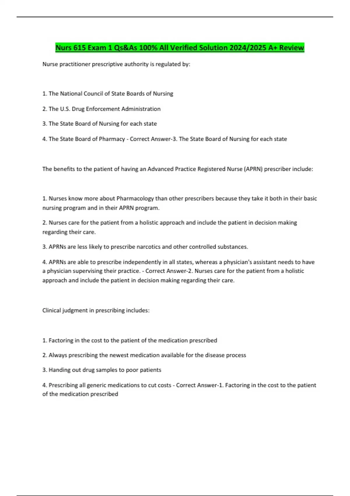 Nurs 615 Exam 1 Qs&As 100% All Verified Solution 2024/2025 A+ Review Nurse practitioner prescriptive authority is regulated by: 1. The National Council of State Boards of Nursing 2. The U.S. Drug Enforcement Administration 3. The State Board of Nursing for each state 4. The State Board of Pharmacy - Correct Answer-3. The State Board of Nursing for each state The benefits to the patient of having an Advanced Practice Registered Nurse (APRN) prescriber include: 1. Nurses know more about Pharmacology than other prescribers because they take it both in their basic nursing program and in their APRN program. 2. Nurses care for the patient from a holistic approach and include the patient in decision making regarding their care. 3. APRNs are less likely to prescribe narcotics and other controlled substances. 4. APRNs are able to prescribe independently in all states, whereas a physician's assistant needs to have a physician supervising their practice. - Correct Answer-2. Nurses care for the patient from a holistic approach and include the patient in decision making regarding their care. Clinical judgment in prescribing includes: 1. Factoring in the cost to the patient of the medication prescribed 2. Always prescribing the newest medication available for the disease process 3. Handing out drug samples to poor patients 4. Prescribing all generic medications to cut costs - Correct Answer-1. Factoring in the cost to the patient of the medication prescribed Criteria for choosing an effective drug for a disorder include Continues...