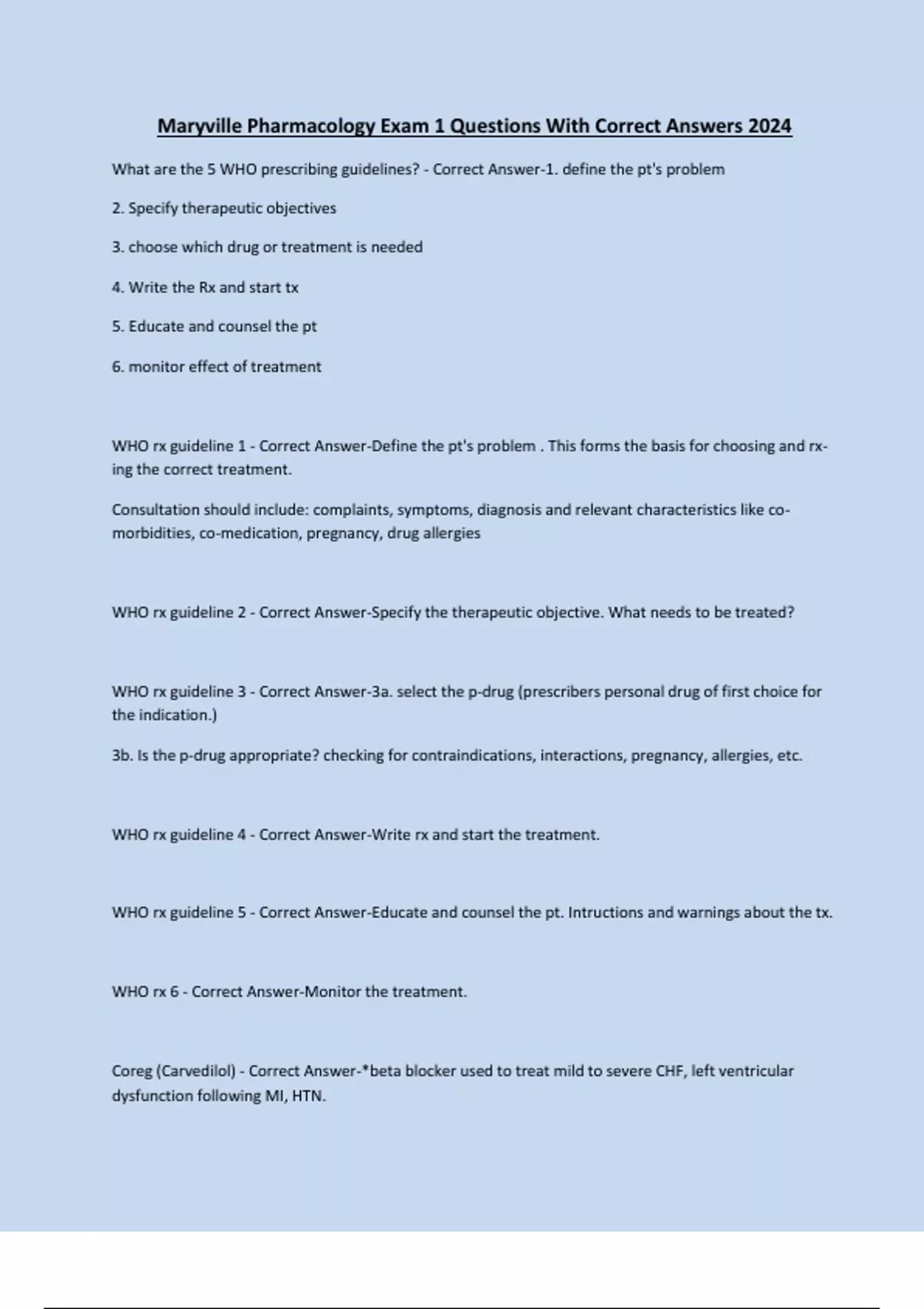 Maryville Pharmacology Exam 1 Questions With Correct Answers 2024 What are the 5 WHO prescribing guidelines? - Correct Answer-1. define the pt's problem 2. Specify therapeutic objectives 3. choose which drug or treatment is needed 4. Write the Rx and start tx 5. Educate and counsel the pt 6. monitor effect of treatment WHO rx guideline 1 - Correct Answer-Define the pt's problem . This forms the basis for choosing and rxing the correct treatment. Consultation should include: complaints, symptoms, diagnosis and relevant characteristics like comorbidities, co-medication, pregnancy, drug allergies WHO rx guideline 2 - Correct Answer-Specify the therapeutic objective. What needs to be treated? WHO rx guideline 3 - Correct Answer-3a. select the p-drug (prescribers personal drug of first choice for the indication.) 3b. Is the p-drug appropriate? checking for contraindications, interactions, pregnancy, allergies, etc. WHO rx guideline 4 - Correct Answer-Write rx and start the treatment. WHO rx guideline 5 - Correct Answer-Educate and counsel the pt. Intructions and warnings about the tx. WHO rx 6 - Correct Answer-Monitor the treatment. Coreg (Carvedilol) - Correct Answer...