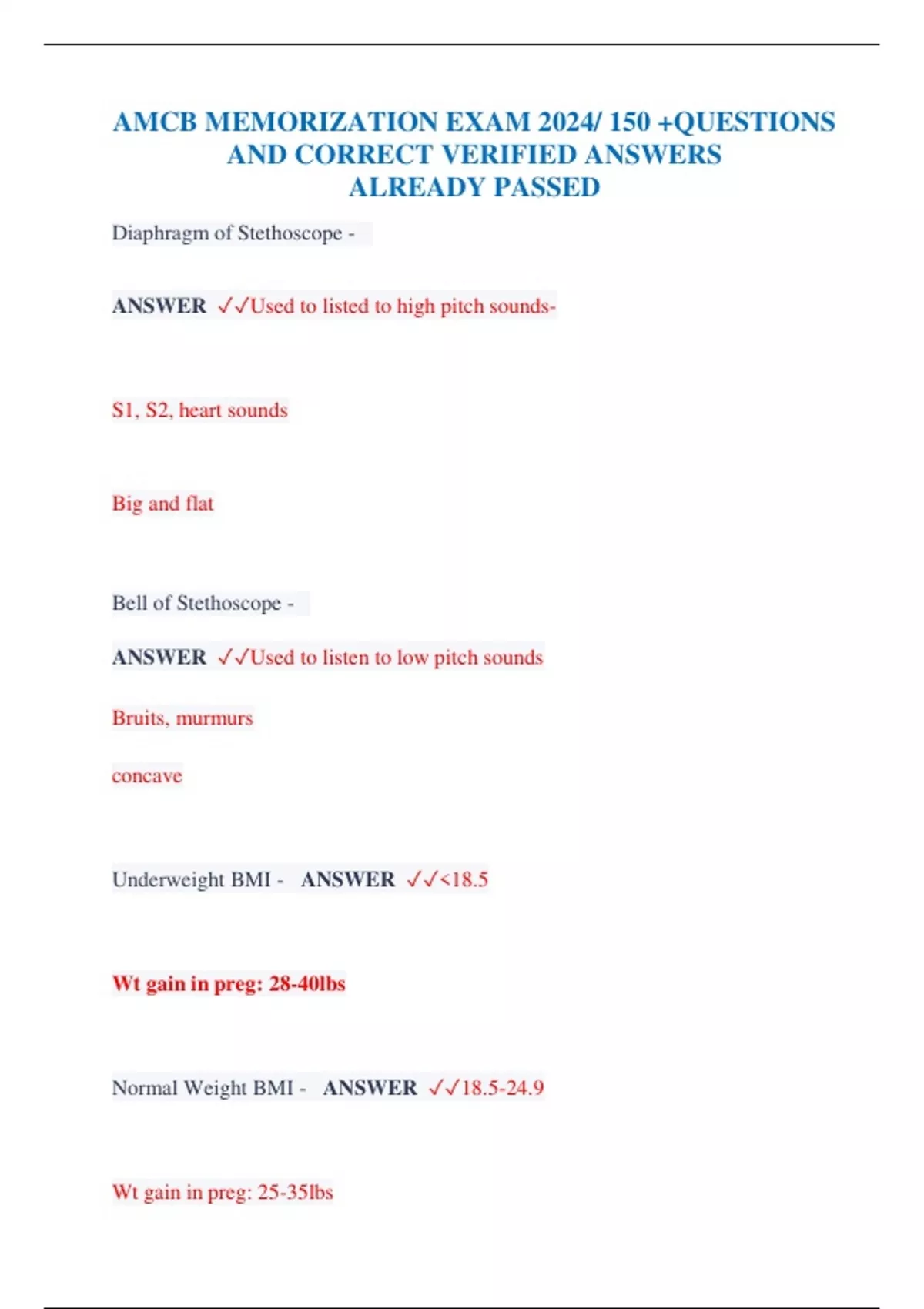 AMCB MEMORIZATION EXAM 2024/ 150 +QUESTIONS AND CORRECT VERIFIED ANSWERS ALREADY PASSED Diaphragm of Stethoscope - ANSWER ✓✓Used to listed to high pitch sounds - S1, S2, heart sounds Big and flat Bell of Stethoscope - ANSWER ✓✓Used to listen to low pitch sounds Bruits, murmurs concave Underweight BMI - ANSWER ✓✓<18.5 Wt gain in preg: 28-40lbs Normal Weight BMI - ANSWER ✓✓18.5-24.9 Wt gain in preg: 25-35lbs Overweight BMI - ANSWER ✓✓25-29.9 Wt gain in preg: 15-25lbs Obese BMI - ANSWER ✓✓30-39.9 Weight Gain in preg: 11-20lbs Extreme Obesity BMI - ANSWER ✓✓>40 RBCs - ANSWER ✓✓4.2-5.4 Hematocrit - ANSWER ✓✓33% in 1st and 3rd trimester 32% in 2nd trimester -2% for Black women Hemogobin - ANSWER ✓✓11 in 1st and 3rd trimester 10.5 in 2nd -0.8 for Black Women MCV - ANSWER ✓✓Average volume or size of a single RBC 80-100 WBC - ANSWER ✓✓3,900 -12,500 Up to 16,900 is normal in 3rd trimester HbA1c - ANSWER ✓✓<5.7 >6.5%=DM ADA Criteria for DX of DM (primary care) - ANSWER ✓✓Random glucose > 200 + s/s of Hyperglycemia Fasting of 126 or greater Two hr PP of 200 or greater Total cholesterol - ANSWE R ✓✓<200 mg/dL May be elevated in pregnancy Triglycerides - ANSWER ✓✓35-