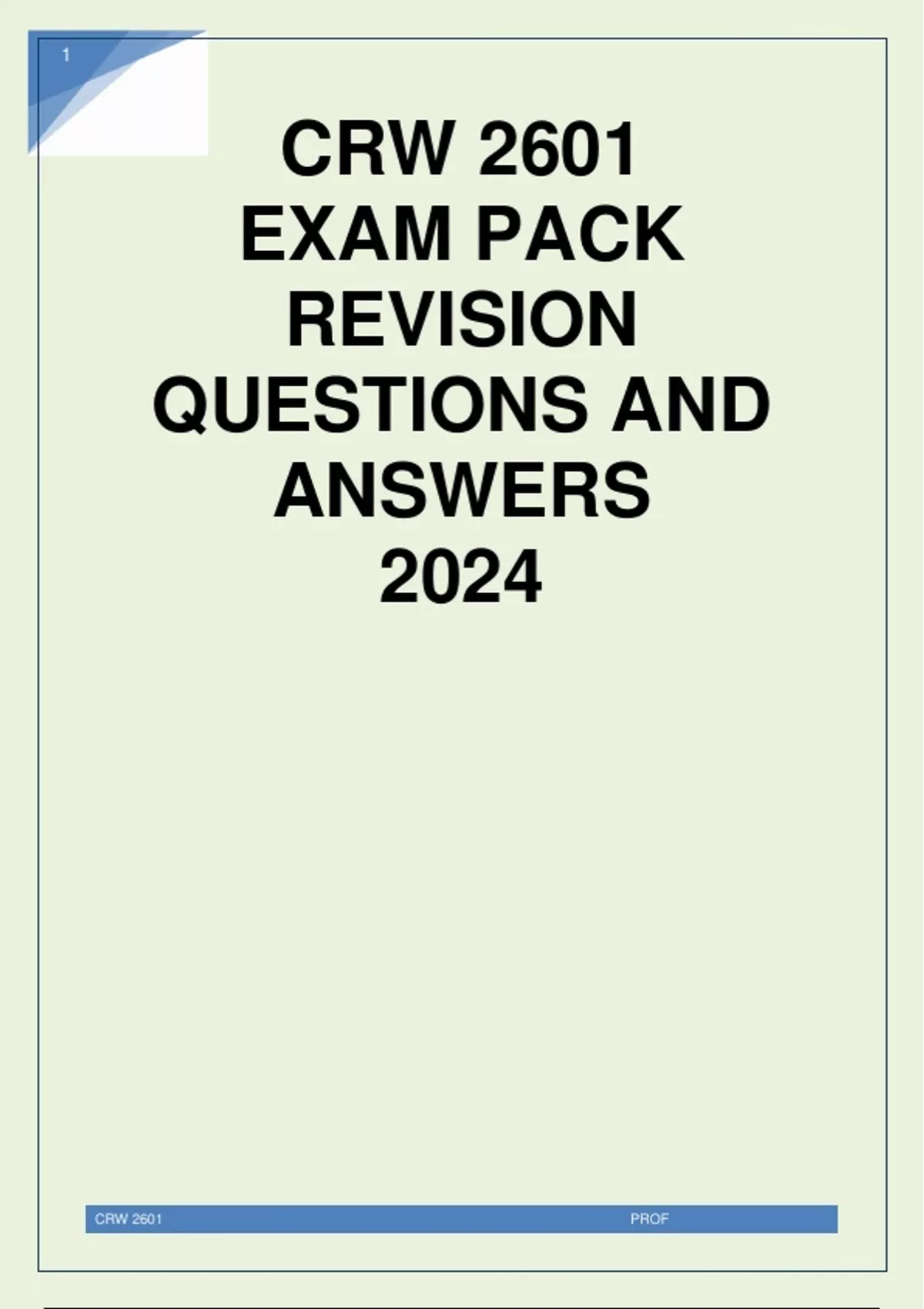 CRW 2601 General Principles of Criminal Law 2024 CRW 2601 EXAM PACK REVISION QUESTIONS AND ANSWERS 2024 CRW 2601 PROF 2 Multiple Choice Q’s Question 1 (a) According to the absolute theory, punishment is an end in itself, while according to the relative theories, punishment is a means to a secondary end. (b) The effectiveness of the theory of general deterrence depends only on the severity of the punishment that is imposed on an offender. (c) The “triad in Zinn” (the crime, the criminal and interests of society) enables a court to consider all the theories of punishment when imposing sentence. (1) All the statements are correct. (2) Only statement (a) is correct. (3) Only statements (a) and (c) are correct. (4) Only statement (c) is correct. (5) Only statement (b) is correct. Question 2 (a) The correct sequence of investigation into the elements of criminal liability is conduct, compliance with definitional elements, culpability and unlawfulness. (b) Crimes are directed against public interests, while delicts are directed against private interests. (c) A statutory provision will best comply with the principle of legality if it contains a criminal norm only. (1) Only statement (b) is correct. (2) Only statements (b) and (c) are correct. (3) None of the statements is correct. (4) Only statement (a) is correct. (5) Only statement (c) is correct. Question 3 (a) In concluding that the extended definition of the crim