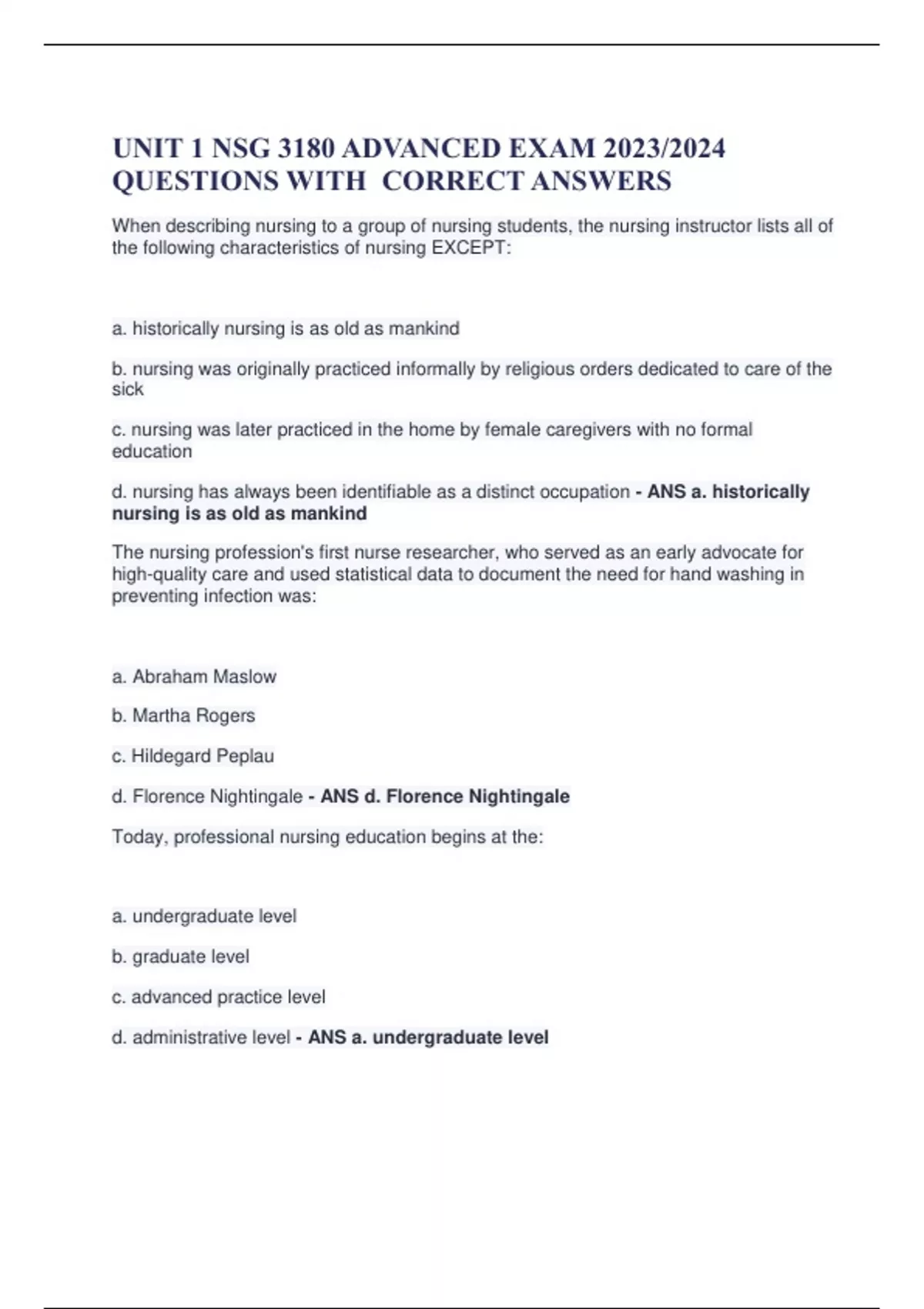 UNIT 1 NSG 3180 ADVANCED EXAM 2023/2024 QUESTIONS WITH CORRECT ANSWERS When describing nursing to a group of nursing students, the nursing instructor lists all of the following characteristics of nursing EXCEPT: a. historically nursing is as old as mankind b. nursing was originally practiced informally by religious orders dedicated to care of the sick c. nursing was later practiced in the home by female caregivers with no formal education d. nursing has always been identifiable as a distinct occupation - ANS a. historically nursing is as old as mankind The nursing profession's first nurse researcher, who served as an early advocate for high-quality care and used statistical data to document the need for hand washing in preventing infection was: a. Abraham Maslow b. Martha Rogers c. Hildegard Peplau d. Florence Nightingale - ANS d. Florence Nightingale Today, professional nursing education begins at the: a. undergraduate level b. graduate level c. advanced practice level d. administrative level - ANS a. undergraduate level Nursing's metaparadigm, or worldview, distinguishes the nursing profession from other disciplines and emphasizes its unique functional characteristics. The four key concepts that form the foundation for all nursing theories are: a. caring, compassion, health promotion, and education b. respect, integrity, honesty, and advocacy c. person, environment, health, and nursing d. nursing, teaching, caring, and health promotion - ANS c. person, environment, health, and nursing When admitting a patient to the medical-surgical unit, the nurse asks the patient about cultural issues. The nurse is demonstrating use of the concept of: a. person b. environment c. health d. nursing - ANS b. environment - The concept of environment includes all cultural, developmental, and social determinants that influence a client's health perception and behavior Nurses are prepared to function as: - ANS - advanced practice nurse practitioners - administrators - educators A young mother tells the nurse, "im worried because my son needs a blood transfusion. I don't know what to do, because blood transfusions cause AIDS." Which central nursing construct is represented in this situation? a. Environment b. caring c. health d. person - ANS d. person