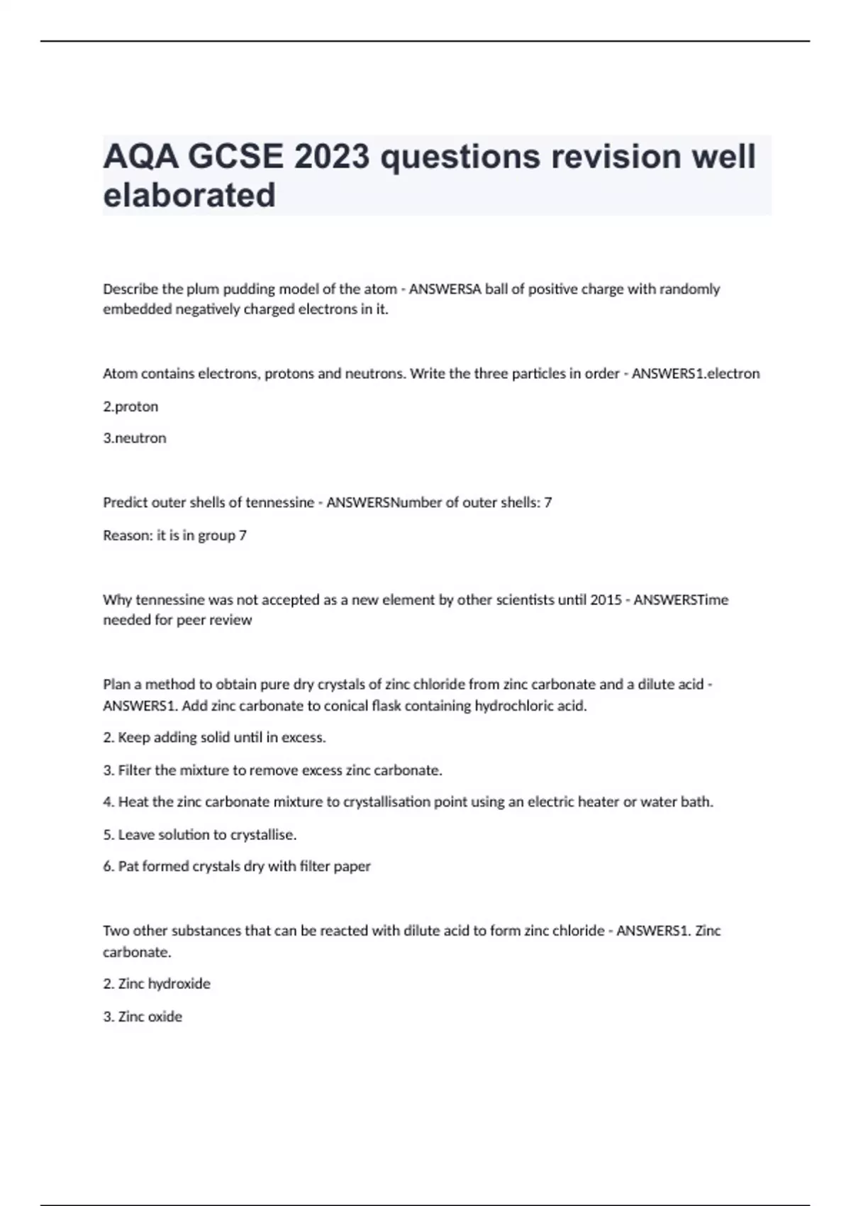 Describe the plum pudding model of the atom - ANSWERSA ball of positive charge with randomly embedded negatively charged electrons in it. Atom contains electrons, protons and neutrons. Write the three particles in order - ANSWERSron n on Predict outer shells of tennessine - ANSWERSNumber of outer shells: 7 Reason: it is in group 7 Why tennessine was not accepted as a new element by other scientists until 2015 - ANSWERSTime needed for peer review Plan a method to obtain pure dry crystals of zinc chloride from zinc carbonate and a dilute acid - ANSWERS1. Add zinc carbonate to conical flask containing hydrochloric acid. 2. Keep adding solid until in excess. 3. Filter the mixture to remove excess zinc carbonate. 4. Heat the zinc carbonate mixture to crystallisation point using an electric heater or water bath. 5. Leave solution to crystallise. 6. Pat formed crystals dry with filter paper Two other substances that can be reacted with dilute acid to form zinc chloride - ANSWERS1. Zinc carbonate. 2. Zinc hydroxide 3. Zinc oxide 4. Zinc Explain why methane and poly (ethene) exist in different states at room temperature - ANSWERSMethane consists of much smaller molecules therefore it has weaker intermolecular forces needing less energy to overcome, therefore the boiling point is lower and remains in gaseous state. However poly(ethene) consists of larger molecules and has stronger intermolecular forces requiring higher energy to overcome. Therefore, the boiling point of poly(ethene) is much higher and it remains in solid state. What is meant by a weak acid? - ANSWERSThe acid only partially ionises, does not fully dissociate in an aqueous solution Name an indicator that can be used in titration. Give the colour change of indicator when acid from burette is added to alkali in flask - ANSWERSName of indicator: phenolpthalein Colour change: pink - colourless Or Name of indicator: damp litmus paper Colour change: blue to red Give formula of ion which makes a solution alkaline - ANSWERSOH- A solution of hydrochloric acid has a pH of 4.5 has a concentration of H+ ions of 3.16 * 10-5 mol/dm3 What is concentration of H+ ions in a solution of hydrochloric acid with pH 2.5? - ANSWERSConcentration of H+ ions = 3.16 * 10-3 How metals conduct electricity? - ANSWERSMetals have delocalised electrons which carry electrical charge throughout the structure of the metal Why do alloys not conduct electricity as well as pure metals? - ANSWERSIn alloys, different sized atoms distort the layers so movement of delocalised electrons is restricted Complete the half equation for reaction occurring at negative electrode. Al3+ + e- - Al - ANSWERSAl3+ + 3e- - Al Cryolite contains Na+ ions as well as Al3+ ions. Suggest one why reason why sodium is not a product of electrolysis - ANSWERSSodium is more reactive than aluminium. Explain how oxygen was produced from water during electrolysis of aqueous solution. - ANSWERSWater molecules break down to produce hydroxide and hydrogen ions. OH- ions are attracted to positive electrode where OH- ions are oxidised to produce oxygen molecules How student can change the apparatus to compare the volume of two gases more accurately - ANSWERSChange: use measuring cylinders instead of test tubes Reason: there is a scale on the measuring cylinder Explain why argon does not form compounds - ANSWERSArgon atoms have a stable electronic configuration so they can't transfer electrons Two observations when barium reacts with hydrochloric acid - ANSWERS1. Vigorous bubbling 2. Barium disappears Nanoparticles of titanium dioxide are used instead of fine particles of titanium dioxide for self coating windows - ANSWERS1. They have higher surface area to volume ration. 2. There is less material required for the same effect. Balanced symbol equation for barium and hydrochloric acid - ANSWERSBa + 2HCL - BaCl2 + H2 Predict whether tellerium reacts with metals - ANSWERSYes, tellerium is on the right side of the periodic table therefore it is a non metal which can react with metals so it can gain electrons