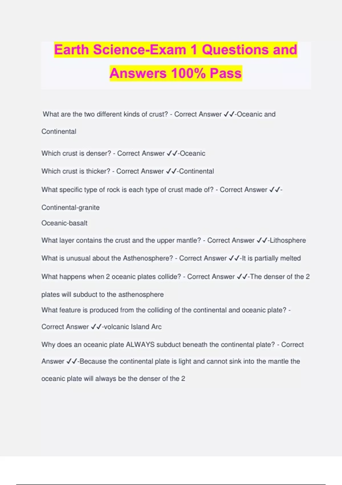Earth Science-Exam 1 Questions and Answers 100% Pass What are the two different kinds of crust? - Correct Answer ️️ -Oceanic and Continental Which crust is denser? - Correct Answer ️️ -Oceanic Which crust is thicker? - Correct Answer ️️ -Continental What specific type of rock is each type of crust made of? - Correct Answer ️️ - Continental-granite Oceanic-basalt What layer contains the crust and the upper mantle? - Correct Answer ️️ -Lithosphere What is unusual about the Asthenosphere? - Correct Answer ️️ -It is partially melted What happens when 2 oceanic plates collide? - Correct Answer ️️ -The denser of the 2 plates will subduct to the asthenosphere What feature is produced from the colliding of the continental and oceanic plate? - Correct Answer ️️ -volcanic Island Arc Why does an oceanic plate ALWAYS subduct beneath the continental plate? - Correct Answer ️️ -Because the continental plate is light and cannot sink into the mantle the oceanic plate will always be the denser of the 2 Along what type of plate boundaries does explosive(intermediate-felsic) volcanism occur? - Correct Answer ️️ -convergent p.b Along what type of p.b does passive(mafic) volcanism occur? - Correct Answer ️️ - divergent p.b Where along the 48 states is plate collision currently taking place? - Correct Answer ️️ -California, Oregon and Washington What feature has formed as a result of this collision? - Correct Answer ️️ -continental volcanic arc-cascade range What and where is the most famous transform p.b. in North America? - Correct Answer ️️ -san andreas fault in central and southern California What is a hot spot? - Correct Answer ️️ -Huge column of every hot rock rising from great depth; a volcanic zone located about hot rising plumes Where are the two hot spots in the USA? - Correct Answer ️️ -Hawaii and Wyoming What 5 qualifications must be met for a substance to qualify as a mineral? - Correct Answer ️️ -a. solid b. naturally occurring c. inorganic d. definite chemical composition e. specific internal composition Define the 4 MAJOR physical properties of minerals - Correct Answer ️️ -luster- the way that light reflects off of a mineral color, streak, and hardness-a minerals resistance to scratching What 3 factors influence the physical properties of minerals? - Correct Answer ️️ - chemical composition, specific internal structure and strengths of the chemical bonds holding the atoms together What is the difference btwn magma and lava? - Correct Answer ️️ -magma- exists within the earths surface lava- exists upon earths surface What are the 2 kinds of igneous rock? - Correct Answer ️️ -plutonic and volcanic What feature distinguishes the 2 different igneous rocks from each other? - Correct Answer ️️ -texture What 2 characteristics of an igneous rock MUST be determined before it can be accurately named? - Correct Answer ️️ -composition and texture What is meant by the TEXTURE of an igneous rock? - Correct Answer ️️ -the size of the crystals in the rock What single factor determines whether a rock will acquire a coarse or fine texture? - Correct Answer ️️ -the speed at which the magma's cooling What does the word COMPOSITION mean when applied to igneous rock? - Correct