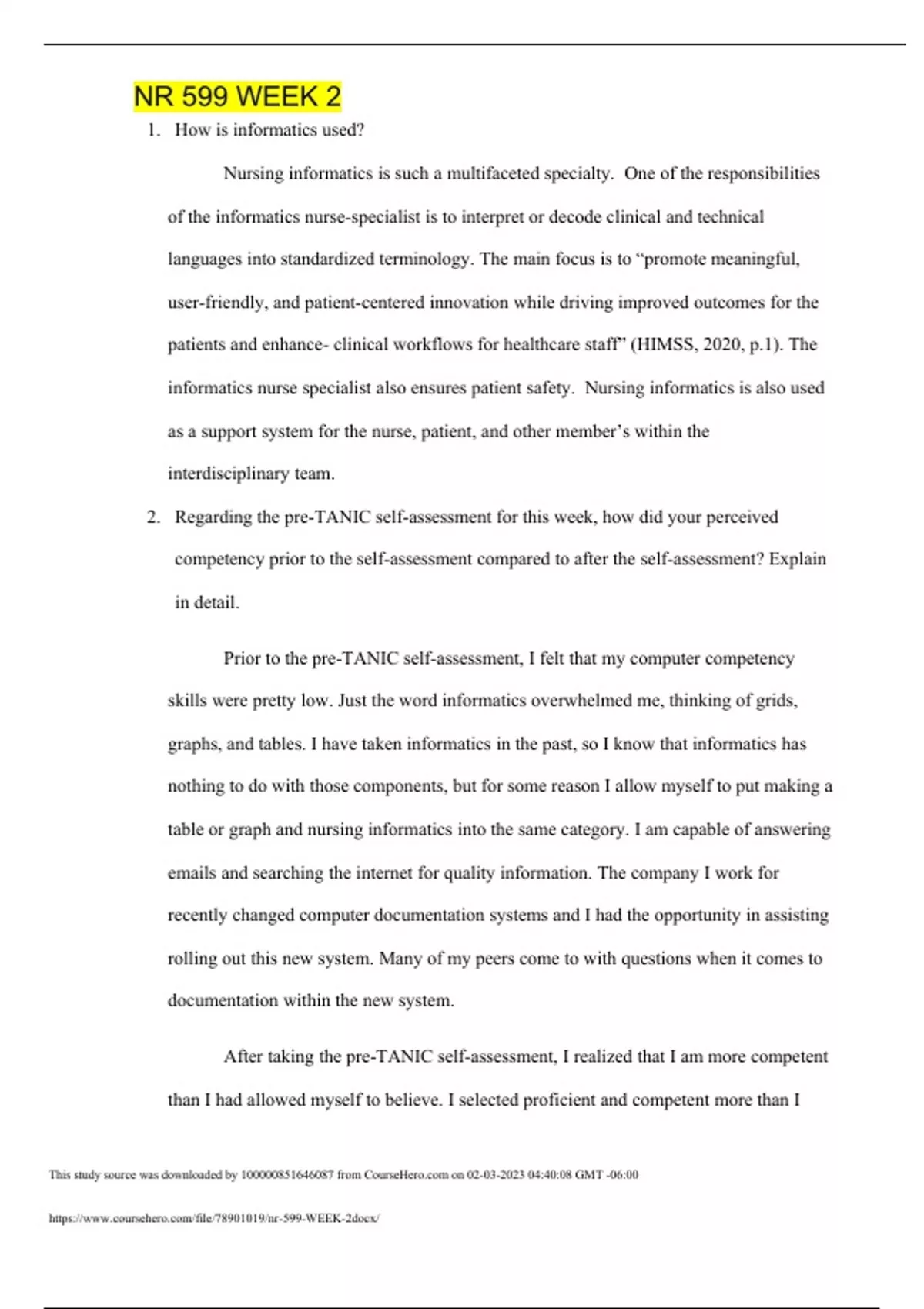NR 599 WEEK 2 1. How is informatics used? Nursing informatics is such a multifaceted specialty. One of the responsibilities of the informatics nurse-specialist is to interpret or decode clinical and technical languages into standardized terminology. The main focus is to “promote meaningful, user-friendly, and patient-centered innovation while driving improved outcomes for the patients and enhance- clinical workflows for healthcare staff” (HIMSS, 2020, p.1). The informatics nurse specialist also ensures patient safety. Nursing informatics is also used as a support system for the nurse, patient, and other member’s within the interdisciplinary team. 2. Regarding the pre-TANIC self-assessment for this week, how did your perceived competency prior to the self-assessment compared to after the self-assessment? Explain in detail. Prior to the pre-TANIC self-assessment, I felt that my computer competency skills were pretty low. Just the word informatics overwhelmed me, thinking of grids, graphs, and tables. I have taken informatics in the past, so I know that informatics has nothing to do with those components, but for some reason I allow myself to put making a table or graph and nursing informatics into the same category. I am capable of answering emails and searching the internet for quality information. The company I work for recently changed computer documentation systems and I had the opportunity in assisting rolling out this new system. Many of my peers come to with questions when it comes to documentation within the new system. After taking the pre-TANIC self-assessment, I realized that I am more competent than I had allowed myself to believe. I selected proficient and competent more than I expected. The questions on the survey asked about skills that I unknowingly use every day without second-guessing myself. Maneuvering through the EHR is a task that I can easily complete. There were some questions on this survey that answered novice to. However, those questions will not impact the care and resources I provide my patients. 3. What TWO competencies do you use in your current clinical role? Provide examples. In my current clinical role, one of the competencies that I use is computer literacy. Computer literacy is important to the role of nursing due to computerized documentation of patient assessments, vital signs, care plan, and patient education within the electronic health record. Improper charting may lead to inappropriate treatments to the patient. We also use secure chat to keep in touch with the provider and we can secure chat with the patient’s family, keeping them update to date on the patient status. Per our company policy we are to only give positive updates through this system. Chatting with families over secure chat is new for our hospital and has been implanted due to our no visitor policy during the pandemic. Another competency that I use in my current clinical role is information literacy. Education is one of the most important actions of a nurse. Having the ability to provide the patient with up to date and accurate information is essential. Most hospitals have a place within their intranet that allows the nurse to retrieve educational material. Unfortunately, not all the needed education material can be found within the system. Information literacy allows me to accurately pull information off the internet. 4. Identify TWO resources to develop a strategic plan to enhance your competency skills.