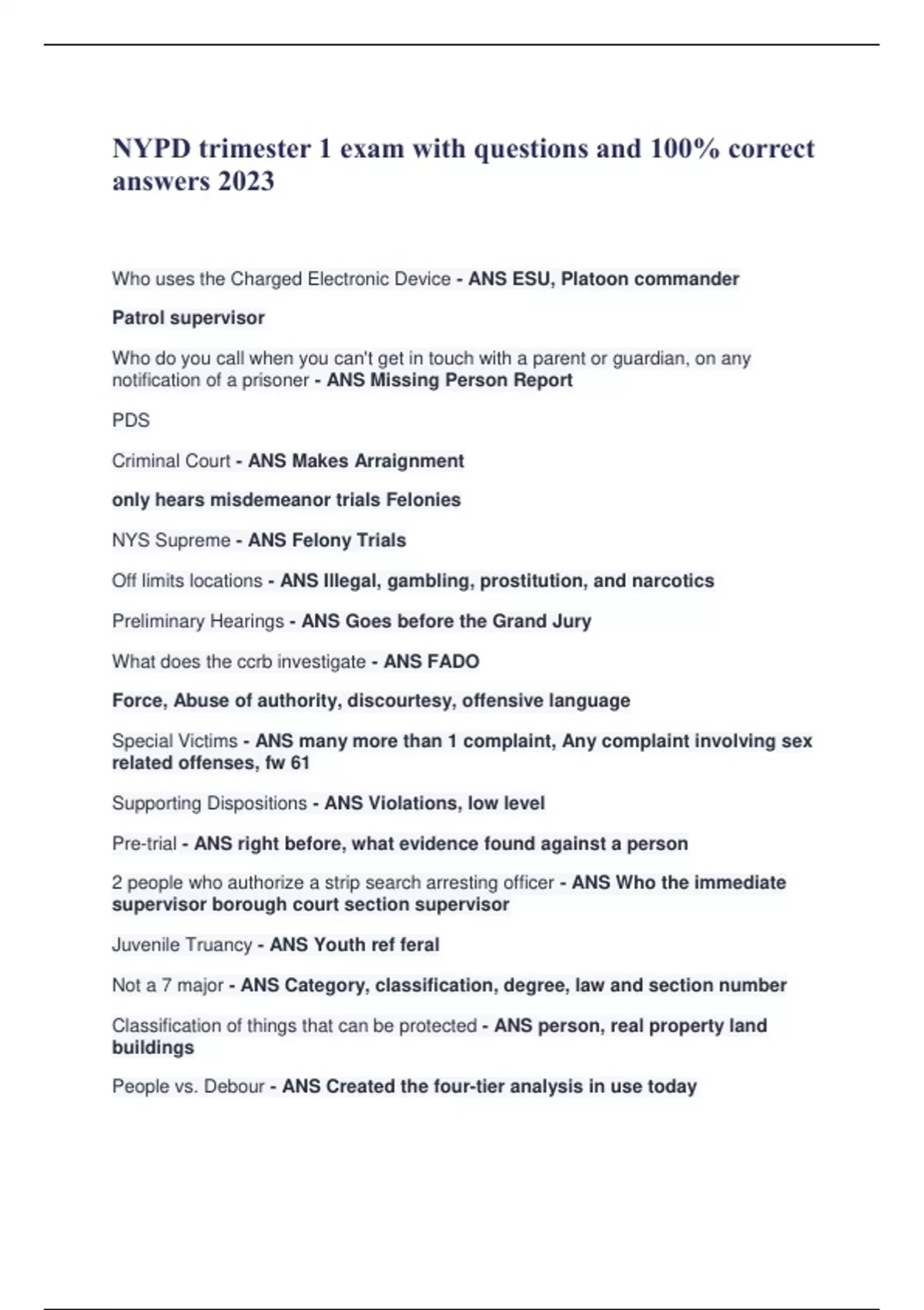 NYPD trimester 1 exam with questions and 100% correct answers 2023 Who uses the Charged Electronic Device - ANS ESU, Platoon commander Patrol supervisor Who do you call when you can't get in touch with a parent or guardian, on any notification of a prisoner - ANS Missing Person Report PDS Criminal Court - ANS Makes Arraignment only hears misdemeanor trials Felonies NYS Supreme - ANS Felony Trials Off limits locations - ANS Illegal, gambling, prostitution, and narcotics Preliminary Hearings - ANS Goes before the Grand Jury What does the ccrb investigate - ANS FADO Force, Abuse of authority, discourtesy, offensive language Special Victims - ANS many more than 1 complaint, Any complaint involving sex related offenses, fw 61 Supporting Dispositions - ANS Violations, low level Pre-trial - ANS right before, what evidence found against a person 2 people who authorize a strip search arresting officer - ANS Who the immediate supervisor borough court section supervisor Juvenile Truancy - ANS Youth ref feral Not a 7 major - ANS Category, classification, degree, law and section number Classification of things that can be protected - ANS person, real property land buildings People vs. Debour - ANS Created the four-tier analysis in use today