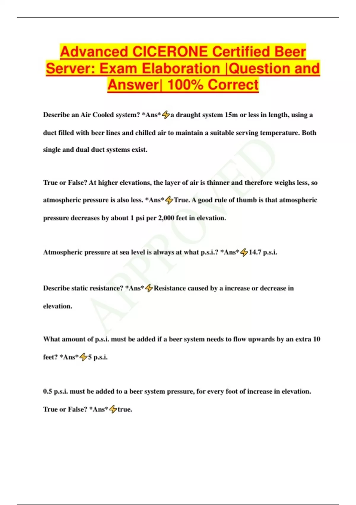 Advanced CICERONE Certified Beer Server: Exam Elaboration |Question and Answer| 100% Correct Describe an Air Cooled system? *Ans* a draught system 15m or less in length, using a duct filled with beer lines and chilled air to maintain a suitable serving temperature. Both single and dual duct systems exist. True or False? At higher elevations, the layer of air is thinner and therefore weighs less, so atmospheric pressure is also less. *Ans* True. A good rule of thumb is that atmospheric pressure decreases by about 1 psi per 2,000 feet in elevation. Atmospheric pressure at sea level is always at what p.s.i.? *Ans* 14.7 p.s.i. Describe static resistance? *Ans* Resistance caused by a increase or decrease in elevation. What amount of p.s.i. must be added if a beer system needs to flow upwards by an extra 10 feet? *Ans* 5 p.s.i. 0.5 p.s.i. must be added to a beer system pressure, for every foot of increase in elevation. True or False? *Ans* true. Dynamic resistance is also called Hardware resistance. True or false? *Ans* True. This form of resistance is caused by the gauge of tubing used in the beer system. What is False Head? *Ans* Large soap-like bubbles on the top of beer What is false head caused by? *Ans* 1. dry glassware 2. improper beer pouring What style of Jockey Box dispense system can pour beer the fastest? *Ans* the Coil style system. True or false? A coil style system can pour beer correctly at room temperature. *Ans* True, if the room temp is at or below 23 C (74F). Overall impression of Sahti? *Ans* A sweet, heavy, strong traditional Finnish beer with a rye, juniper, and juniper berry flavor and a strong banana-clove yeast character. Overall impression of Piwo Grodziskie? *Ans* A low-gravity, highly-carbonated, lightbodied ale combining an oak-smoked flavour with a clean hop bitterness. Highly sessionable. Overall impression of Wheat Wine? *Ans* A richly textured, high alcohol sipping beer with a significant grainy, bready flavor and sleek body. The emphasis is first on the bready, wheaty flavors with interesting complexity from malt, hops, fruity yeast character and alcohol complexity. Overall impression of Lichtenhainer? *Ans* A sour, smoked, lower-gravity historical German wheat beer. Complex yet refreshing character due to high attenuation and carbonation, along with low bitterness and moderate sourness. Overall impression of German Liechtbier? *Ans* A pale, highly-attenuated, light-bodied German lager with lower alcohol and calories than normal strength beers. Moderately bitter with noticeable malt and hop flavours, the beer is still interesting to drink. Overall impression of Roggenbier? *Ans* A dunkel weizen made with rye rather than wheat, but with a greater body and light finishing hops. British Strong Ale has a significant gravity overlap with which other similar style? *Ans* Old Ale. Significant overlap in gravity with old ales, but not having a stale or aged character. Overall impression of London Brown Ale? *Ans* A luscious, sweet, malt-oriented dark brown ale, with caramel and toffee malt complexity and a sweet finish. Overall impression of Kellerbier? *Ans* A young, fresh Helles, so while still a malty, fully-attenuated Pils malt showcase, the hop character (aroma, flavor and bitterness) is more pronounced, and the beer is cloudy, often with some level of diacetyl, and possibly has some green apple and/or other yeast-derived notes. True or False? To make Real Ale, a small proportion of yeast cells must be kept alive and transferred into the cask. These will intern, create the secondary fermentation in the cask. *Ans* True. True or false? Bottle conditioned Real Ale has the primary yeast filtered out, and then fresh yeast added back before bottling. *Ans* True. Preferably a strain that will form a solid deposit on the bottom of the bottle. Real Ale definition? *Ans* A name for draught or bottled beer brewed from traditional ingredients, matured by secondary fermentation in the container from which it is dispensed, and served without the use of extraneous carbon dioxide. after venting a cask prior to service, you should insert a _____________? *Ans* soft