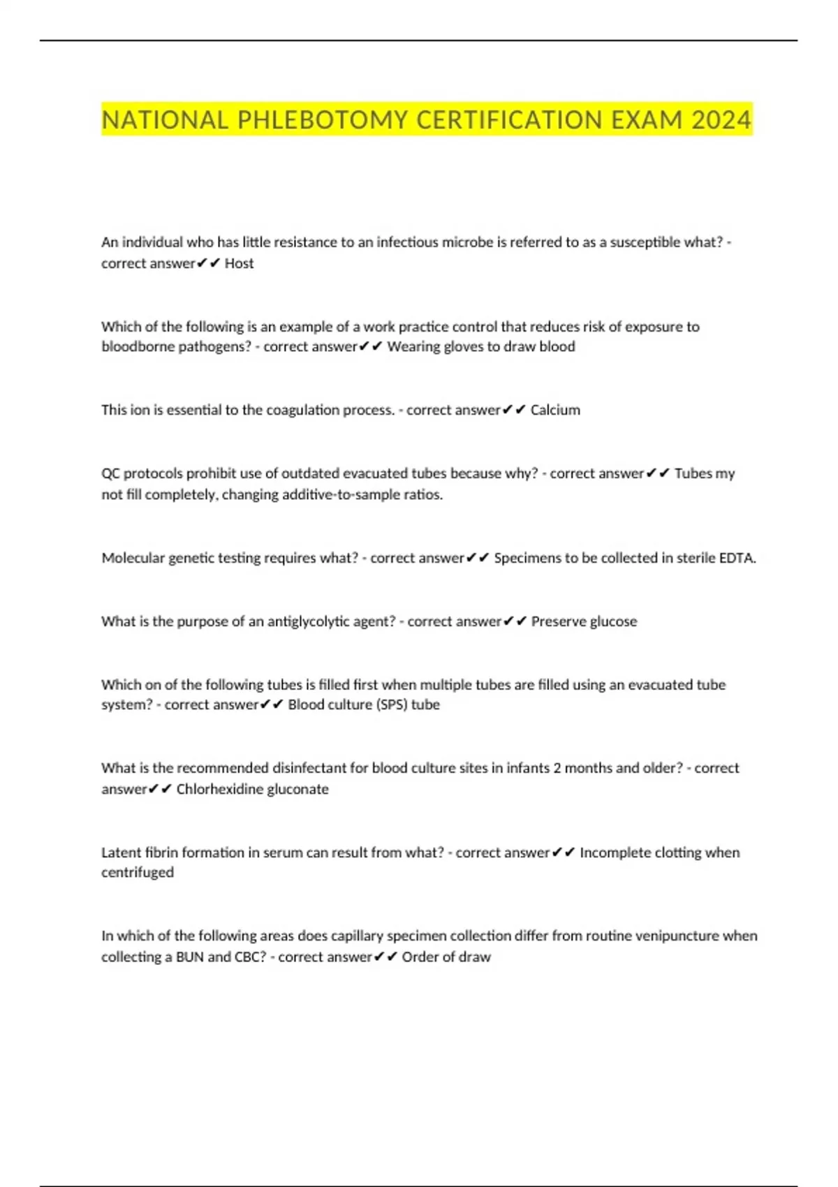 NATIONAL PHLEBOTOMY CERTIFICATION EXAM 2024 An individual who has little resistance to an infectious microbe is referred to as a susceptible what? - correct answer Host Which of the following is an example of a work practice control that reduces risk of exposure to bloodborne pathogens? - correct answer Wearing gloves to draw blood This ion is essential to the coagulation process. - correct answer Calcium QC protocols prohibit use of outdated evacuated tubes because why? - correct answer Tubes my not fill completely, changing additive-to-sample ratios. Molecular genetic testing requires what? - correct answer Specimens to be collected in sterile EDTA. What is the purpose of an antiglycolytic agent? - correct answer Preserve glucose Which on of the following tubes is filled first when multiple tubes are filled using an evacuated tube system? - correct answer Blood culture (SPS) tube What is t