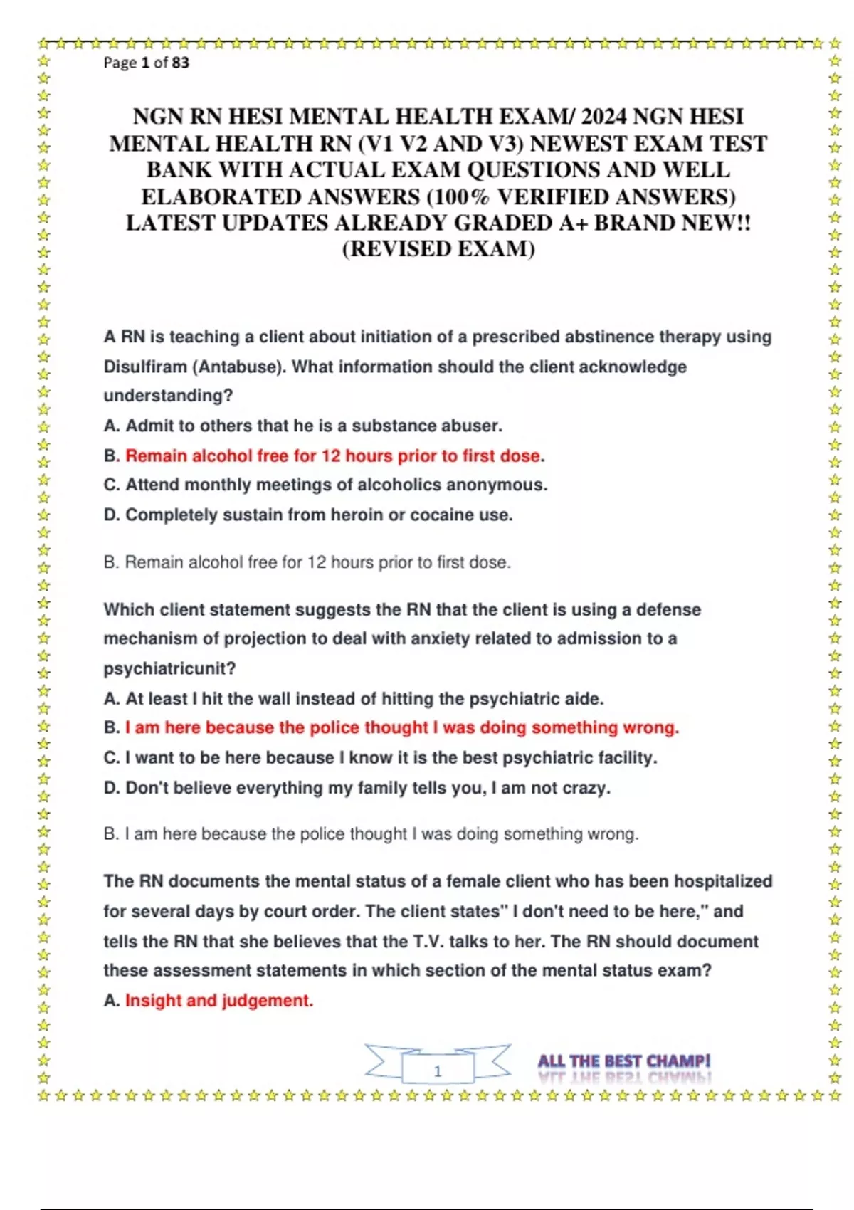 NGN RN HESI MENTAL HEALTH EXAM- 2024 NGN HESI MENTAL HEALTH RN (V1 V2 AND V3) NEWEST EXAM TEST BANK WITH ACTUAL EXAM QUESTIONS AND WELL ELABORATED ANSWERS (100- VERIFIED ANSWERS) LATEST UPDATES ALREADY GRADED A+.