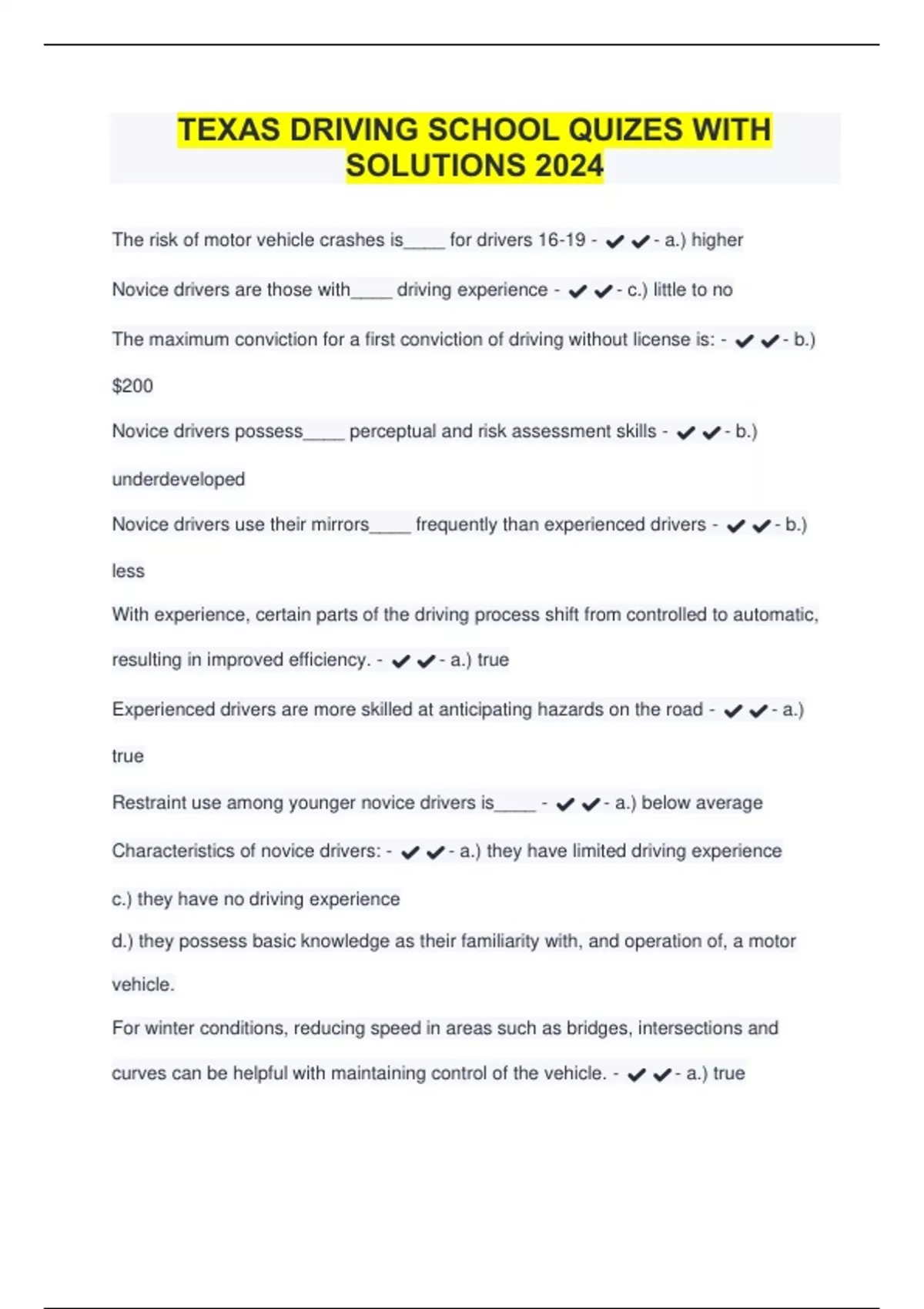 TEXAS DRIVING SCHOOL QUIZES WITH SOLUTIONS 2024 The risk of motor vehicle crashes is____ for drivers 16-19 - ️️ - a.) higher Novice drivers are those with____ driving experience - ️️ - c.) little to no The maximum conviction for a first conviction of driving without license is: - ️️ - b.) $200 Novice drivers possess____ perceptual and risk assessment skills - ️️ - b.) underdeveloped Novice drivers use their mirrors____ frequently than experienced drivers - ️️ - b.) less With experience, certain parts of the driving process shift from controlled to automatic, resulting in improved efficiency. - ️️ - a.) true Experienced drivers are more skilled at anticipating hazards on the road - ️️ - a.) true Restraint use among younger novice drivers is____ - ️️ - a.) below average Characteristics of novice drivers: - ️️ - a.) they have limited driving experience c.) they have no driving experience d.) they possess basic knowledge as their familiarity with, and operation of, a motor vehicle. For winter conditions, reducing speed in areas such as bridges, intersections and curves can be helpful with maintaining control of the vehicle. - ️️ - a.) true The name of the program used in Texas to allow young drivers the chance to improve their driving skills in comparatively lower-risk environment is called the: - ️️ - d.) graduated Driver License Program Drivers under 18 will be issued a____ license that allows them limited driving privileges - ️️ - a.) provisional While you have an instruction permit, you must be accompanied by an adult of at least____ years old while you are driving - ️️ - b.) 21 Once a driver under the age of 18 receives a class A, B, or C driver license, their license is placed on provisional status for____ months - ️️ - b.) 12 (1 year) Provisional license holders are prohibited from driving between hours of midnight and 5 am. - ️️ - a.) true How many non-family passengers under the age of 21 many accompany a driver with a provisional license? - ️️ - a.) 1 Provisional license hol