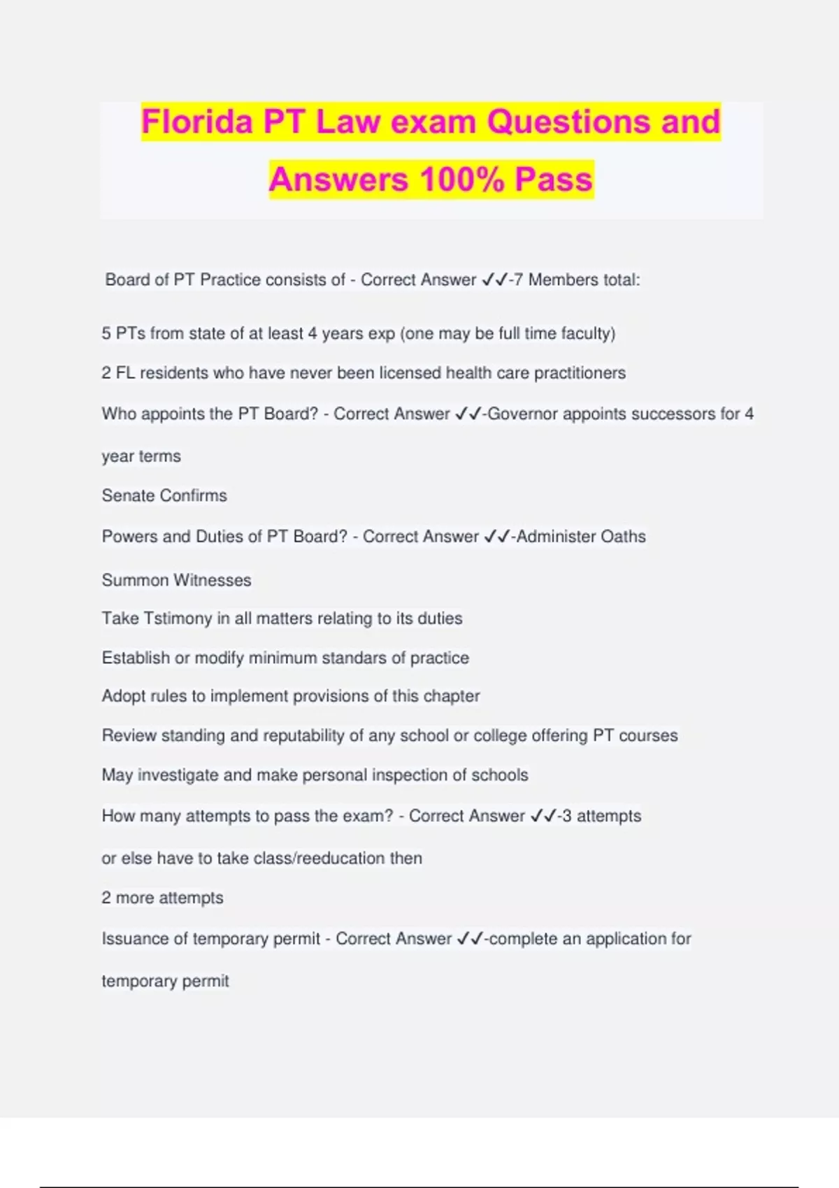 Florida PT Law exam Questions and Answers 100% Pass Board of PT Practice consists of - Correct Answer ️️ -7 Members total: 5 PTs from state of at least 4 years exp (one may be full time faculty) 2 FL residents who have never been licensed health care practitioners Who appoints the PT Board? - Correct Answer ️️ -Governor appoints successors for 4 year terms Senate Confirms Powers and Duties of PT Board? - Correct Answer ️️ -Administer Oaths Summon Witnesses Take Tstimony in all matters relating to its duties Establish or modify minimum standars of practice Adopt rules to implement provisions of this chapter Review standing and reputability of any school or college offering PT courses May investigate and make personal inspection of schools How many attempts to pass the exam? - Correct Answer ️️ -3 attempts or else have to take class/reeducation then 2 more attempts Issuance of temporary permit - Correct Answer ️️ -complete an application for temporary permit Graduate from approved place Submits an application for licensure Demonstratres proof of posessing malpractice insurance Submits documentation verifying the participant will practice under direct supervision of licensed PT Is a temporary permit renewable? - Correct Answer ️️ -Not renewable Voided if do not pass NPTE within 6 months after date of graduation The supervising PT of someone on a temp license must - Correct Answer ️️ -Cosign all patient records produced by temp Must be a licensed PT of minimum of 6 months before supervision can begin Renewal of license; inactive status; reactivation of license; fees - Correct Answer ️️ - $200 renews continuing ed may not exceed 10 classroom hours for each year license was inactive To reactivate either continuing ed or: - Correct Answer ️️ -Engaged in PT practice in good standing in another state for 4 years immediately preceding filing application for reactivation Makes application for and passes the examination as provided and pays the fee PTA licensing fee - Correct Answer ️️ -<= 100 PTA licensure without examination fee - Correct Answer ️️ -<= $175 PTA renewal fee - Correct Answer ️️ -<= $150 How many CEU's every 2 years? - Correct Answer ️️ -24 What CEUs are approved? - Correct Answer ️️ -Sponsored by accredited college or university Sponsored or approved by FPTA or APTA Refusal, revocation or suspension of license - Correct Answer ️️ -Unable to PT well due to illness, drugs, or mental/physical condition Fraud Convicted or guilty of crime in any jursidiction which directly relat