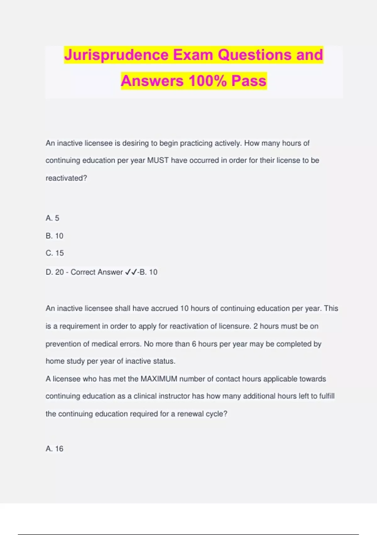Jurisprudence Exam Questions and Answers 100% Pass An inactive licensee is desiring to begin practicing actively. How many hours of continuing education per year MUST have occurred in order for their license to be reactivated? A. 5 B. 10 C. 15 D. 20 - Correct Answer ️️ -B. 10 An inactive licensee shall have accrued 10 hours of continuing education per year. This is a requirement in order to apply for reactivation of licensure. 2 hours must be on prevention of medical errors. No more than 6 hours per year may be completed by home study per year of inactive status. A licensee who has met the MAXIMUM number of contact hours applicable towards continuing education as a clinical instructor has how many additional hours left to fulfill the continuing education required for a renewal cycle? A. 16 B. 18 C. 20 D. 22 - Correct Answer ️️ -B. 18 Per every two year renewal cycle, there is a requirement of 24 contact hours. As a CI, a licensee is able to obtain a maximum of 6 contact hours, therefore 18 hours are remaining. 1 contact hour as a CI equals 160 hours of clinical practice with a student. Which of the following interventions CANNOT be performed by physical therapists? A. Ultrasound B. Performance of neuromuscular electrical stimulation C. Administration of physician prescribed topical medication D. Spinal manipulations - Correct Answer ️️ -D. Spinal Manipulations In the state of Florida, spinal manipulations fall under the chiropractic scope of practice. Should a patient require a specific spinal manipulation, a referral to a chiropractor shall occur. A patient who is being discharged from PT inquires about personal training. The licensee who owns a gym recommends a personal trainer at the facility. In order for this to be lawful, a written disclosure should contain which of the following portions of information? A. A listing of 2 additional personal trainers that are not associated with any gyms that the licensee owns B. The amount of profit that the licensee will receive from the patient's participation in personal training C. The patient's signature acknowledging receipt of a written disclosure of the licensee's investment D. A documented statement that the patient is no longer under the care of the licensee. - Correct Answer ️️ -A is correct For a patient who is being referred to a facility where a licensee has an investment interest, the following items are needed to be presented in a written disclosure: 1. The existence of the licensee's investment interest 2. Name and address of additional entities that the licensee may be an investor at 3. How the patient has choice in where they receive the stated services 4. The names and addresses of at least 2 alternative providers where the patient can seek similar services A licensee who just renewed their license has how many years until the next renewal cycle? A. 2 B. 3 C. 4 D. 5 - Correct Answer ️️ -A is correct Which of the following criteria will aid a licensee in avoiding disciplinary action following a legally sufficient complaint for impairment through alcohol use? A. Having les than 3 similar complaints in the past 3 years B. Informing the PT supervisor prior to the complaint being submitted C. Participation in a program for impaired practitioners D. The complaint is submitted 6 months following the indicent - Correct Answer ️