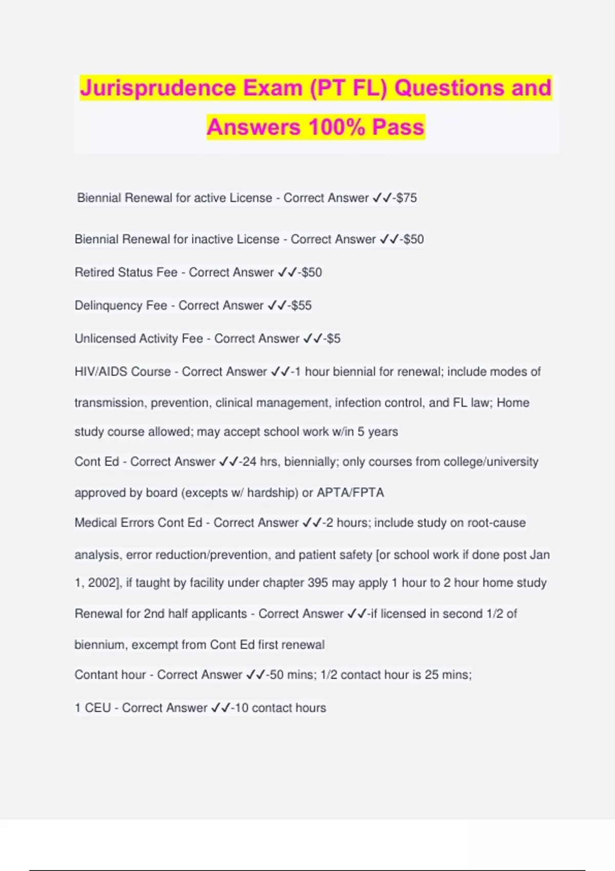 Jurisprudence Exam (PT FL) Questions and Answers 100% Pass Biennial Renewal for active License - Correct Answer ️️ -$75 Biennial Renewal for inactive License - Correct Answer ️️ -$50 Retired Status Fee - Correct Answer ️️ -$50 Delinquency Fee - Correct Answer ️️ -$55 Unlicensed Activity Fee - Correct Answer ️️ -$5 HIV/AIDS Course - Correct Answer ️️ -1 hour biennial for renewal; include modes of transmission, prevention, clinical management, infection control, and FL law; Home study course allowed; may accept school work w/in 5 years Cont Ed - Correct Answer ️️ -24 hrs, biennially; only courses from college/university approved by board (excepts w/ hardship) or APTA/FPTA
