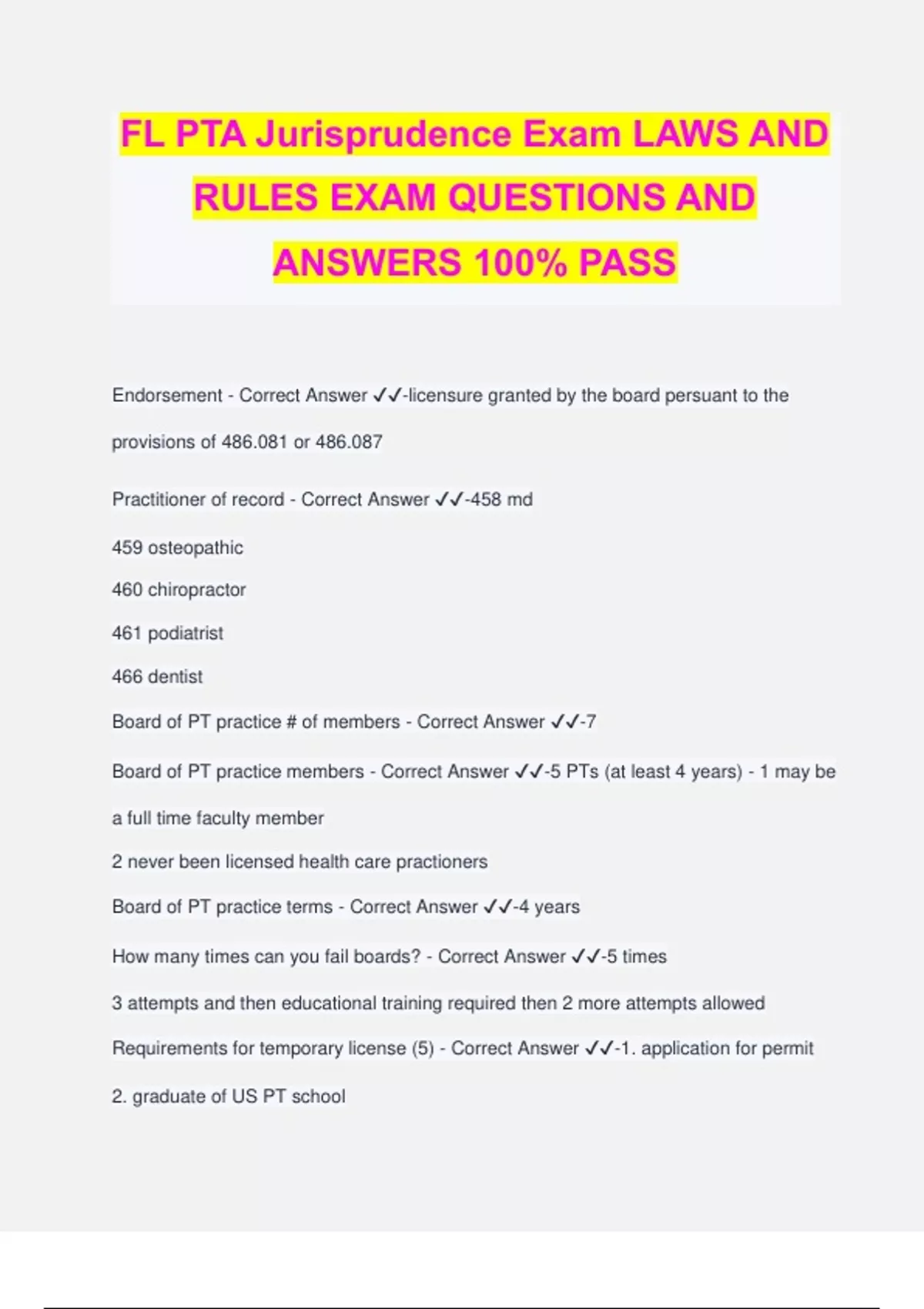 FL PTA Jurisprudence Exam LAWS AND RULES EXAM QUESTIONS AND ANSWERS 100% PASS Endorsement - Correct Answer ️️ -licensure granted by the board persuant to the provisions of 486.081 or 486.087 Practitioner of record - Correct Answer ️️ -458 md 459 osteopathic 460 chiropractor 461 podiatrist 466 dentist Board of PT practice # of members - Correct Answer ️️ -7 Board of PT practice members - Correct Answer ️️ -5 PTs (at least 4 years) - 1 may be a full time faculty member 2 never been licensed health care practioners Board of PT practice terms - Correct Answer ️️ -4 years How many times can you fail boards? - Correct Answer ️️ -5 times 3 attempts and then educational training required then 2 more attempts allowed Requirements for temporary license (5) - Correct Answer ️️ -1. application for permit 2. graduate of US PT school 3. application for licensure 4. proof of malpractice insurance 5. documentation of supervising therapist --must pass laws and rules? temporary license supervising therapist requirements - Correct Answer ️️ -licensed at least 6 months. DIRECT supervision. cosign all records. Temporary permit voiding - Correct Answer ️️ -1. if does not pass NPTE 2. within 6 months Reactivation of a license rules - Correct Answer ️️ -1. fee no greater than 200 2. CEU requirements not greater than 10 hours for each year 3. Has practiced 4 years in another state 4. PAsses NPTE exam Continuing education requirements - Correct Answer ️️ -24 hours 12 can be online 2 prevention of medical errors (no more than 3) 1 HIV/AIDS (no more than 3) no more than 5 hours of risk management Reasons to miss board meeting - Correct Answer ️️ -court order, subpeona, death of family member, illness, hospitalization of immediate family Cannot miss more than 3 consecutive board meetings unless excused. Florida Statutes - Correct Answer ️️ -PT - Chapter 486 other 456 Florida administrative code - Correct Answer ️️ -64b17 Probable cause panel - Correct Answer ️️ -2 people - designate chair (2 members or 1 current and 1 past member) application fees: licensure by endorsement licensure by NPTE Laws and rules exam Initial licensure unlicensed activity fee biennial fee for active biennial fee for inactive retired status fee delinquent status fee reactivate license change of status - Correct Answer ️️ -licensure by endorsement 100 licensure by NPTE 100 Laws and rules exam 25 Initial licensure 75 unlicensed activity fee 5 biennial fee for active 75 biennial fee for inactive 50 retired status fee 50 delinquent status fee 55 reactivate license 50 change of status 40 How many years must you have passed the NPTE and laws and rules to