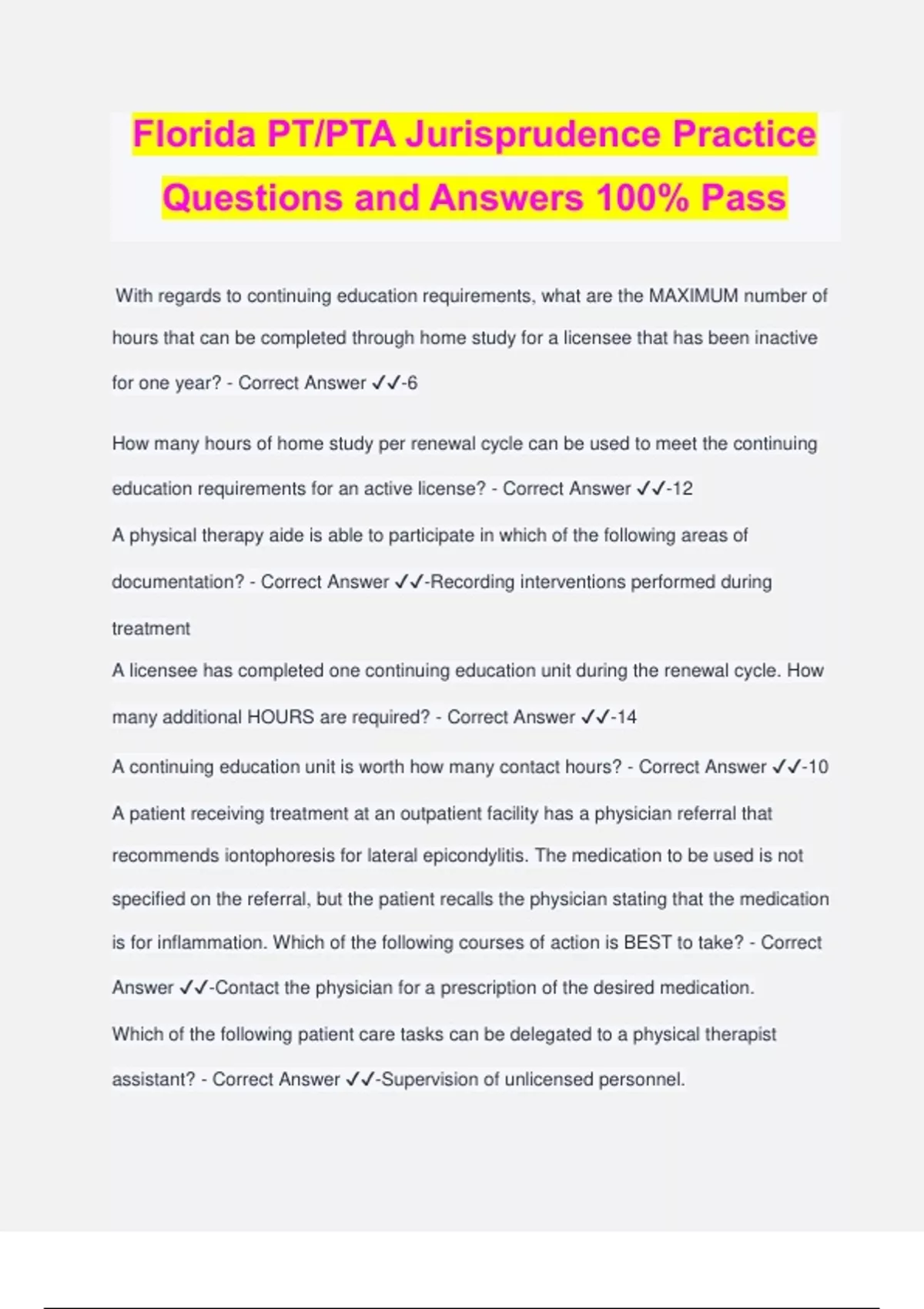 Florida PT/PTA Jurisprudence Practice Questions and Answers 100% Pass With regards to continuing education requirements, what are the MAXIMUM number of hours that can be completed through home study for a licensee that has been inactive for one year? - Correct Answer ️️ -6 How many hours of home study per renewal cycle can be used to meet the continuing education requirements for an active license? - Correct Answer ️️ -12 A physical therapy aide is able to participate in which of the following areas of documentation? - Correct Answer ️️ -Recording interventions performed during treatment A licensee has completed one continuing education unit during the renewal cycle. How many additional HOURS are required? - Correct Answer ️️ -14 A continuing education unit is worth how many contact hours? - Correct Answer ️️ -10 A patient receiving treatment at an outpatient facility has a physician referral that recommends iontophoresis for lateral epicondylitis. The medication to be used is not specified on the referral, but the patient recalls the physician stating that the medication is for inflammation. Which of the following courses of action is BEST to take? - Correct Answer ️️ -Contact the physician for a prescription of the desired medication. Which of the following patient care tasks can be delegated to a physical therapist assistant? - Correct Answer ️️ -Supervision of unlicensed personnel. How many days does a licensee have to notify the Board of Physical Therapy Practice of a change in address? - Correct Answer ️️ -60 A licensee who is closing an outpatient orthopedic clinic is required to keep patient medical records for a MINIMUM of how many years? - Correct Answer ️️ -2 A licensee who has met the MAXIMUM number of contact hours applicable towards continuing education as a clinical instructor has how many additional hours left to fulfill the continuing education required for a renewal cycle? - Correct Answer ️️ -18 As a clinical instructor a licensee is able to obtain a maximum of how many contact hours? - Correct Answer ️️ -6 A physical therapist who is supervising a physical therapist assistant treating a patient with chronic low back pain in an outpatient orthopedic setting is required to be: - Correct Answer ️️ -Available for a telephone call during the session A physical therapist who is seeing a patient through direct access care has how many days to treat prior to having to obtain a referral from a practitioner of record? - Correct Answer ️️ -30 How many hours of human testing are required in order to complete a certification in electromyography? - Correct Answer ️️ -200 An inactive licensee is desiring to begin practicing actively. How many hours of continuing education per year MUST have occurred in order for licensure to be reactivated? - Correct Answer ️️ -10 Which of the following statements is TRUE regarding unlicensed personnel? - Correct Answer ️️ -Two unlicensed personnel can be providing patient directed care simultaneously while supervised by a licensee A patient who is being discharged from physical therapy inquires about personal training. The licensee who owns a gym recommends a personal trainer at the facility. In order for this to be lawful, a written disclosure should contain which of the following portions of information? - Correct Answer ️️ -A listing of two additional personal trainers that are not associated with any gyms the licensee owns. For a patient who is being referred to a facility where a licensee has an investment interest, the following items need to present in a written disclosure: - Correct