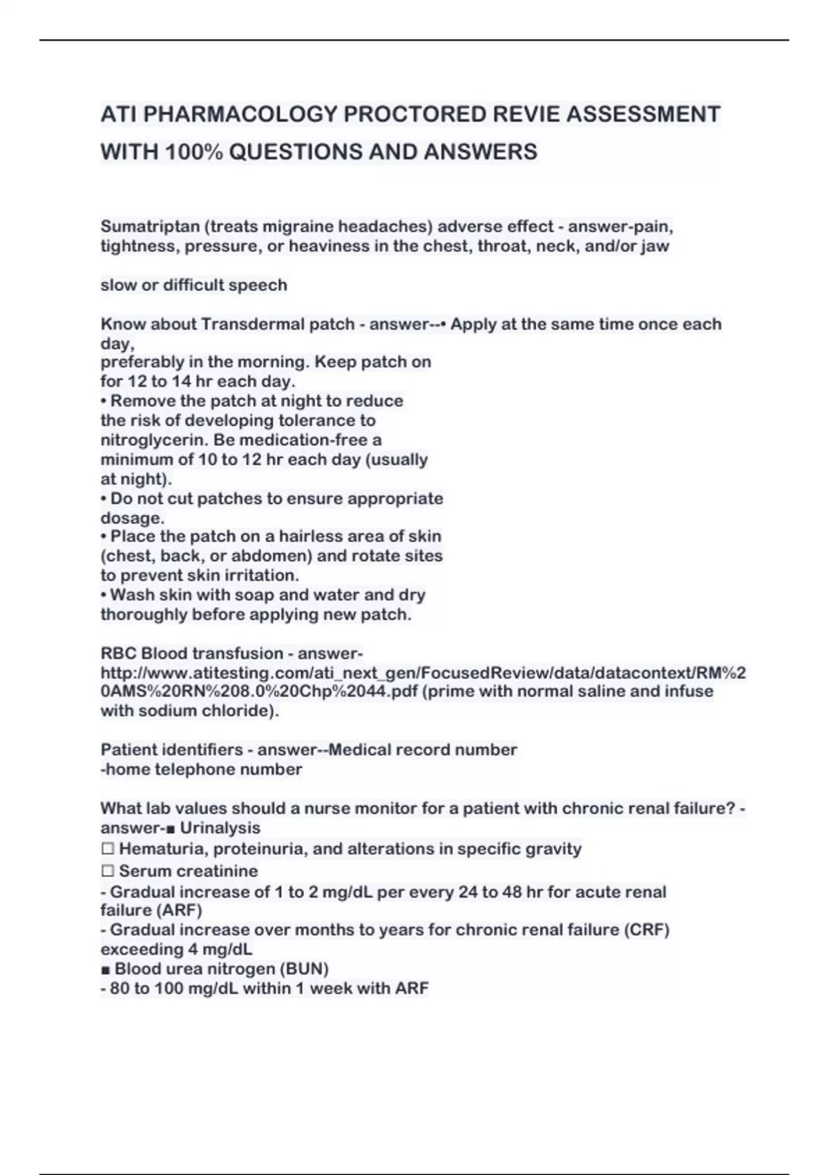 ATI PHARMACOLOGY PROCTORED REVIE ASSESSMENT WITH 100% QUESTIONS AND ANSWERS Sumatriptan (treats migraine headaches) adverse effect - answer-pain, tightness, pressure, or heaviness in the chest, throat, neck, and/or jaw slow or difficult speech Know about Transdermal patch - answer--• Apply at the same time once each day, preferably in the morning. Keep patch on for 12 to 14 hr each day. • Remove the patch at night to reduce the risk of developing tolerance to nitroglycerin. Be medication-free a minimum of 10 to 12 hr each day (usually at night). • Do not cut patches to ensure appropriate dosage. • Place the patch on a hairless area of skin (chest, back, or abdomen) and rotate sites to prevent skin irritation. • Wash skin with soap and water and dry thoroughly before applying new patch. RBC Blood transfusion - answer 0AMS%20RN%208.0%20Chp% (prime with normal saline and infuse with sodium chloride). Patient identifiers - answer--Medical record number -home telephone number What lab values should a nurse monitor for a patient with chronic renal failure? - answer-■ Urinalysis Hematuria, proteinuria, and alterations in specific gravity Serum creatinine - Gradual increase of 1 to 2 mg/dL per every 24 to 48 hr for acute renal failure (ARF) - Gradual increase over months to years for chronic renal failure (CRF) exceeding 4 mg/dL ■ Blood urea nitrogen (BUN) - 80 to 100 mg/dL within 1 week with ARF - Gradual increase with elevated serum creatinine over months to years for CRF - 180-200 mg/dL with (CRF) ■ Serum electrolytes - Decreased sodium (dilutional) and calcium, increased potassium, phosphorus, and magnesium ■ Complete blood count (CBC) - Decreased hemoglobin What food should you increase when taking Lasix? - answer--increased amounts of potassium-rich foods (e.g., bananas, prunes, raisins, and orange juice)