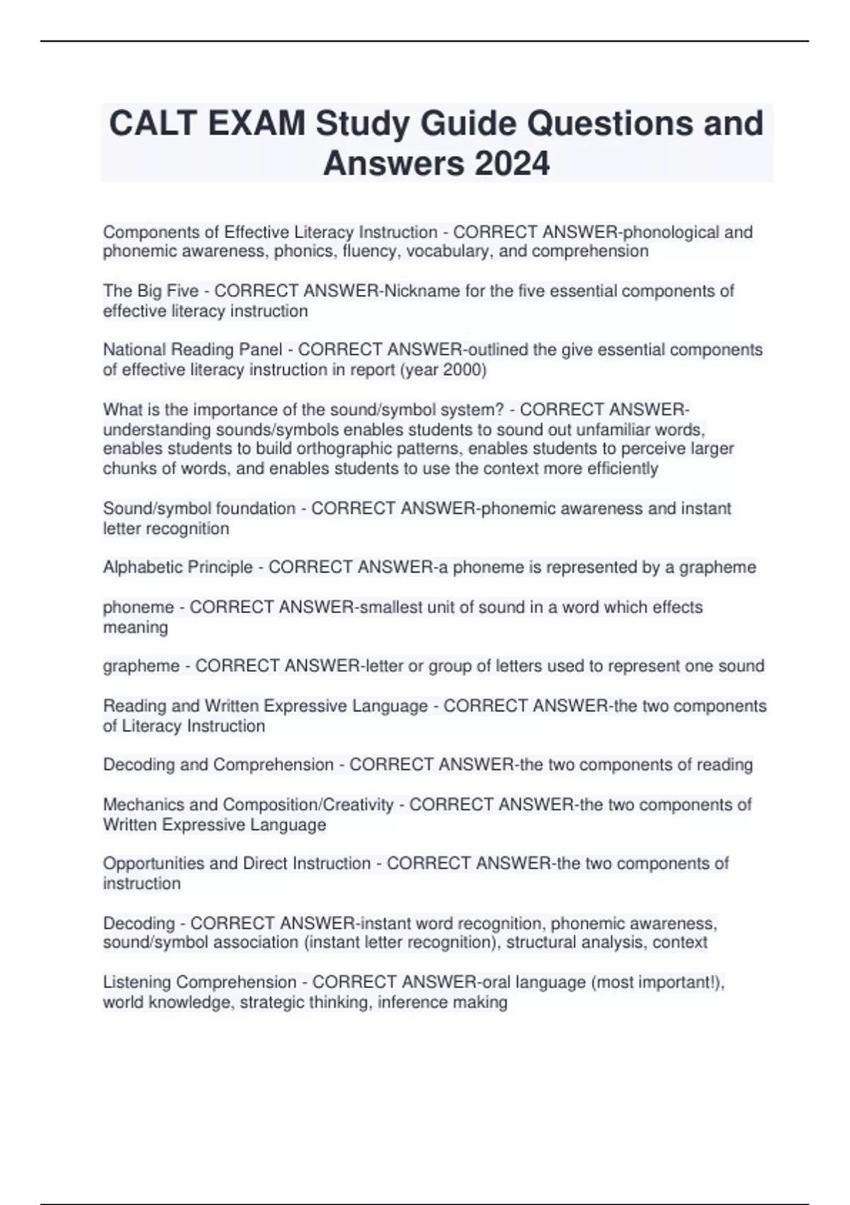 CALT EXAM Study Guide Questions and Answers 2024 Components of Effective Literacy Instruction - CORRECT ANSWER-phonological and phonemic awareness, phonics, fluency, vocabulary, and comprehension The Big Five - CORRECT ANSWER-Nickname for the five essential components of effective literacy instruction National Reading Panel - CORRECT ANSWER-outlined the give essential components of effective literacy instruction in report (year 2000) What is the importance of the sound/symbol system? - CORRECT ANSWERunderstanding sounds/symbols enables students to sound out unfamiliar words, enables students to build orthographic patterns, enables students to perceive larger chunks of words, and enables students to use the context more efficiently Sound/symbol foundation - CORRECT ANSWER-phonemic awareness and instant letter recognition Alphabetic Principle - CORRECT ANSWER-a phoneme is represented by a grapheme phoneme - CORRECT ANSWER-smallest unit of sound in a word which effects meaning grapheme - CORRECT ANSWER-letter or group of letters used to represent one sound Reading and Written Expressive Language - CORRECT ANSWER-the two components of Literacy Instruction Decoding and Comprehension - CORRECT ANSWER-the two components of reading Mechanics and Composition/Creativity - CORRECT ANSWER-the two components of Written Expressive Language Opportunities and Direct Instruction - CORRECT ANSWER-the two components of instruction Decoding - CORRECT ANSWER-instant word recognition, phonemic awareness, sound/symbol association (instant letter recognition), structural analysis, context Listening Comprehension - CORRECT ANSWER-oral language (most important!), world knowledge, strategic thinking, inference making Fluency - CORRECT ANSWER-bridge between decoding and comprehension Comprehension - CORRECT ANSWER-the ultimate goal of reading Instant Word Recognition - CORRECT ANSWER-acquired through repeated exposure to the word and from over learning the patterns of language Mechanics - CORRECT ANSWER-sentence structure, paragraph structure, spelling, handwriting (writer should be comfortable with spelling and handwriting) composition/creativity - CORRECT ANSWER-oral language, world knowledge, strategic thinking, inference making Direct instruction components - CORRECT ANSWER-Multisensory teaching and discovery teaching Domains of language - CORRECT ANSWER-phonology, pragmatics, orthography, semantics, syntax, morphology Interactive components of language - CORRECT ANSWER-Form, content (great ideas), use (spelling, grammar, etc.) Which domains fall into form component of language? - CORRECT ANSWERPhonology, Morphology, Syntax, orthography Which domain falls into the content component of language? - CORRECT ANSWERsemantics Which domain falls into the