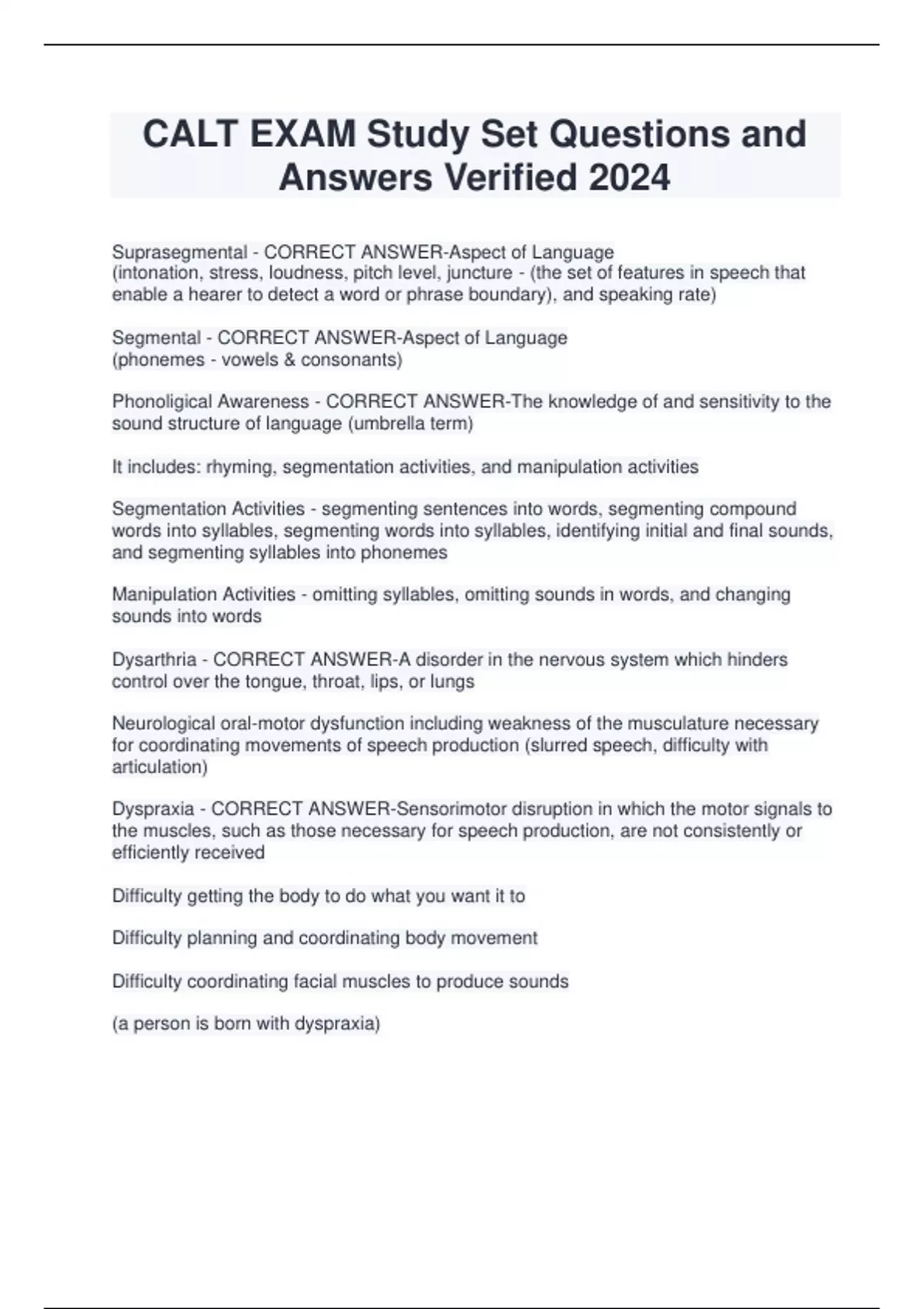 CALT EXAM Study Set Questions and Answers Verified 2024 Suprasegmental - CORRECT ANSWER-Aspect of Language (intonation, stress, loudness, pitch level, juncture - (the set of features in speech that enable a hearer to detect a word or phrase boundary), and speaking rate) Segmental - CORRECT ANSWER-Aspect of Language (phonemes - vowels & consonants) Phonoligical Awareness - CORRECT ANSWER-The knowledge of and sensitivity to the sound structure of language (umbrella term) It includes: rhyming, segmentation activities, and manipulation activities Segmentation Activities - segmenting sentences into words, segmenting compound words into syllables, segmenting words into syllables, identifying initial and final sounds, and segmenting syllables into phonemes Manipulation Activities - omitting syllables, omitting sounds in words, and changing sounds into words Dysarthria - CORRECT ANSWER-A disorder in the nervous system which hinders control over the tongue, throat, lips, or lungs Neurological oral-motor dysfunction including weakness of the musculature necessary for coordinating movements of speech production (slurred speech, difficulty with articulation) Dyspraxia - CORRECT ANSWER-Sensorimotor disruption in which the motor signals to