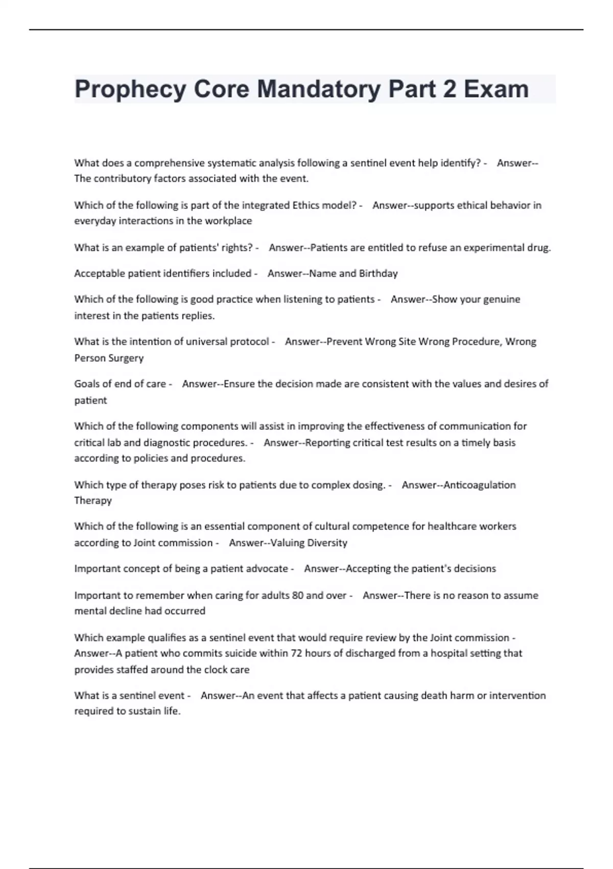 What does a comprehensive systematic analysis following a sentinel event help identify? - Answer--The contributory factors associated with the event. Which of the following is part of the integrated Ethics model? - Answer--supports ethical behavior in everyday interactions in the workplace What is an example of patients' rights? - Answer--Patients are entitled to refuse an experimental drug. Acceptable patient identifiers included - Answer--Name and Birthday Which of the following is good practice when listening to patients - Answer--Show your genuine interest in the patients replies. What is the intention of universal protocol - Answer--Prevent Wrong Site Wrong Procedure, Wrong Person Surgery Goals of end of care - Answer--Ensure the decision made are consistent with the values and desires of patient Which of the following components will assist in improving the effectiveness of communication for critical lab and diagnostic procedures. - Answer--Reporting critical test results on a timely basis according to policies and procedures. Which type of therapy poses risk to patients due to complex dosing. - Answer--Anticoagulation Therapy Which of the following is an essential component of cultural competence for healthcare workers according to Joint commission - Answer--Valuing Diversity Important concept of being a patient advocate - Answer--Accepting the patient's decisions Important to remember when caring for adults 80 and over - Answer--There is no reason to assume mental decline had occurred Which example qualifies as a sentinel event that would require review by the Joint commission - Answer--A patient who commits suicide within 72 hours of discharged from a hospital setting that provides staffed around the clock care What is a sentinel event - Answer--An event that affects a patient causing death harm or intervention required to sustain life.