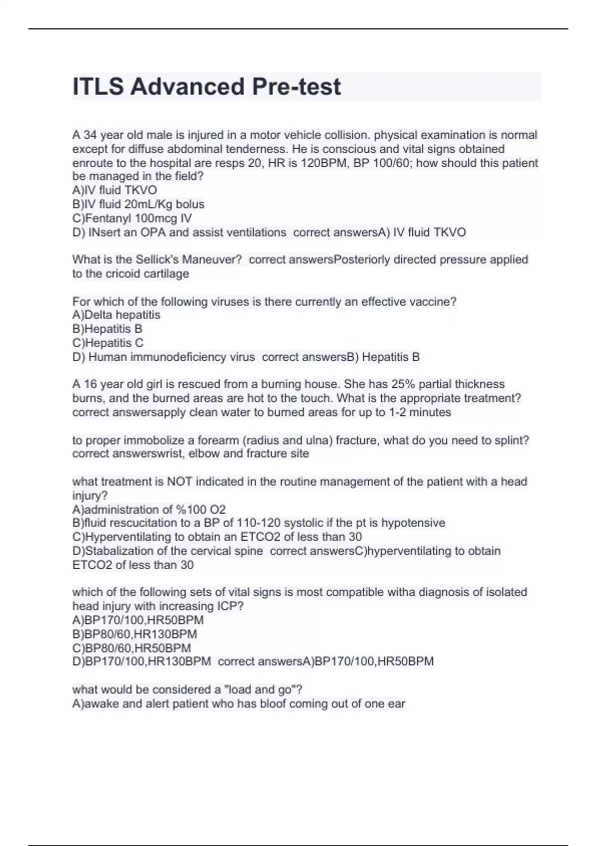 A 34 year old male is injured in a motor vehicle collision. physical examination is normal except for diffuse abdominal tenderness. He is conscious and vital signs obtained enroute to the hospital are resps 20, HR is 120BPM, BP 100/60; how should this patient be managed in the field? A)IV fluid TKVO B)IV fluid 20mL/Kg bolus C)Fentanyl 100mcg IV D) INsert an OPA and assist ventilations correct answersA) IV fluid TKVO What is the Sellick's Maneuver? correct answersPosteriorly directed pressure applied to the cricoid cartilage For which of the following viruses is there currently an effective vaccine? A)Delta hepatitis B)Hepatitis B C)Hepatitis C D) Human immunodeficiency virus correct answersB) Hepatitis B A 16 year old girl is rescued from a burning house. She has 25% partial thickness burns, and the burned areas are hot to the touch. What is the appropriate treatment? correct answersapply clean water to burned areas for up to 1-2 minutes to proper immobolize a forearm (radius and ulna) fracture, what do you need to splint? correct answerswrist, elbow and fracture site what treatment is NOT indicated in the routine management of the patient with a head injury? A)administration of %100 O2 B)fluid rescucitation to a BP of 110-120 systolic if the pt is hypotensive C)Hyperventilating to obtain an ETCO2 of less than 30 D)Stabalization of the cervical spine correct answersC)hyperventilating to obtain ETCO2 of less than 30 which of the following sets of vital signs is most compatible witha diagnosis of isolated head injury with increasing ICP? A)BP170/100,HR50BPM B)BP80/60,HR130BPM C)BP80/60,HR50BPM D)BP170/100,HR130BPM correct answersA)BP170/100,HR50BPM what would be considered a "load and go"? A)awake and alert patient who has bloof coming out of one ear